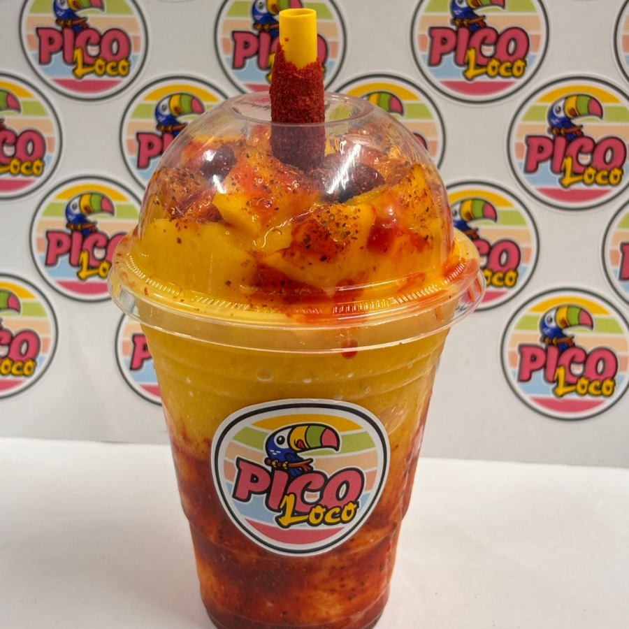 Jarabe de Mango natural con mango picado, bañado con chamoy y tajin