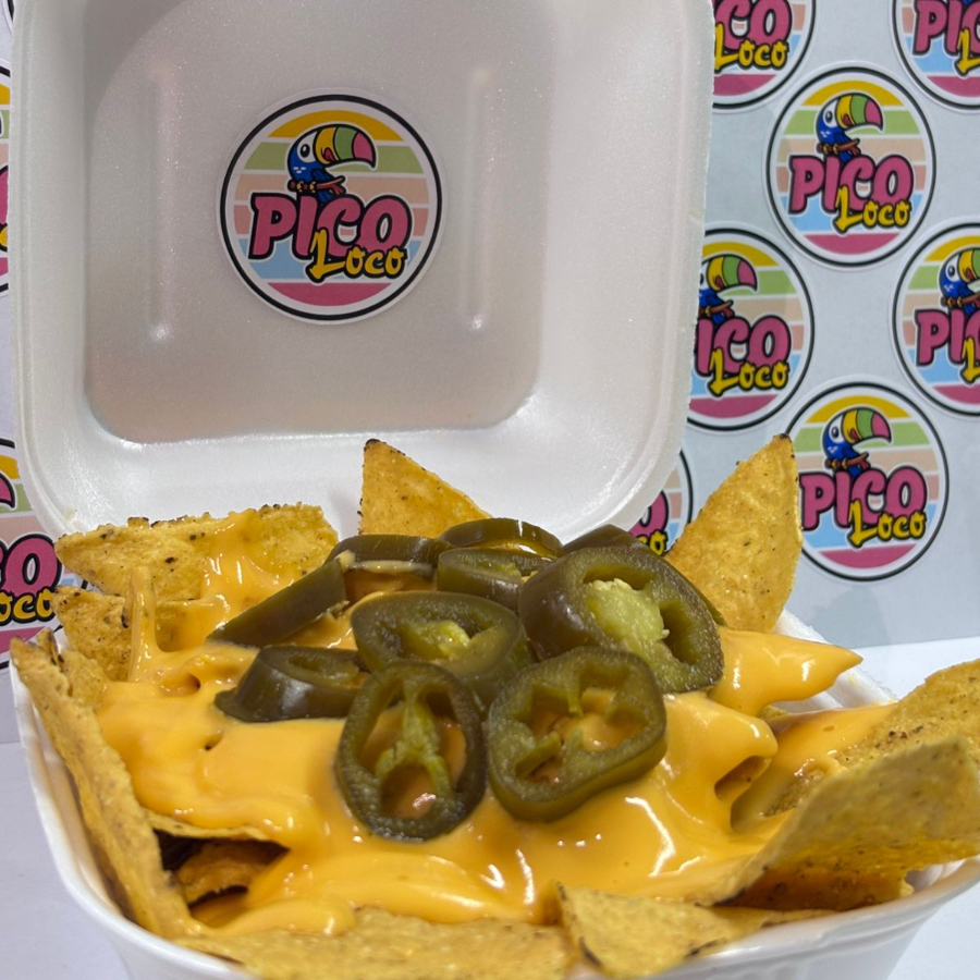 Elote preparado con mayonesa, queso, crema y chile en polvo, servido con tostitos crujientes.