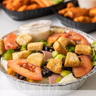 Lechuga, tomate, champiñon, morron, aceituna negra, jamon, peperoncini y croutones, acompañada de aderezo ranch.
