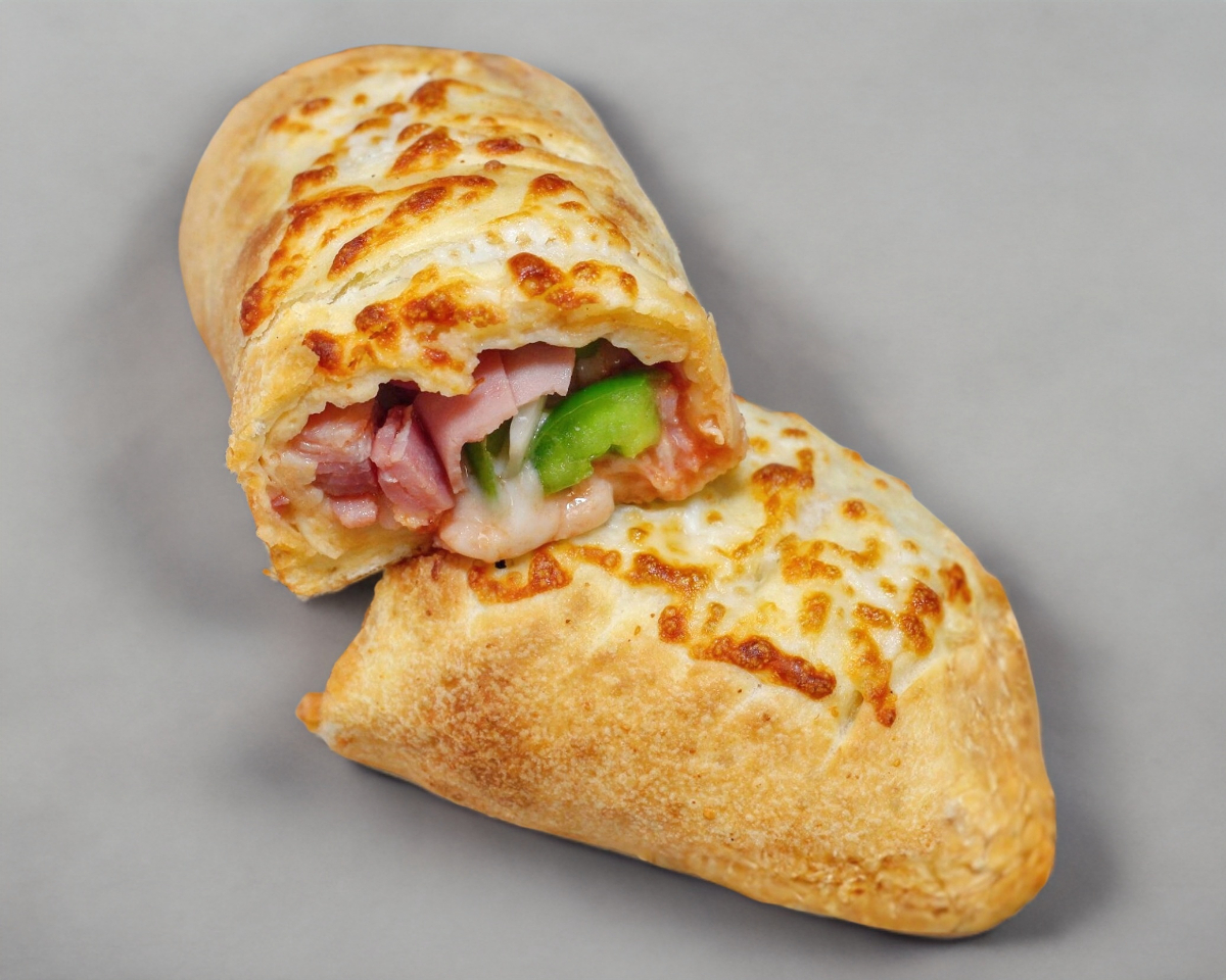 Rollo de masa horneada rellena de pechuga de pollo, jamón, queso mozzarella y chile morrón.