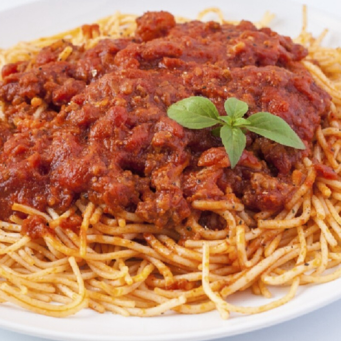 Una orden de espaguetti, aderezada con salsa para pizza y salchicha italiana