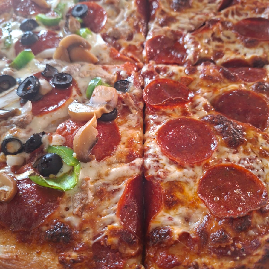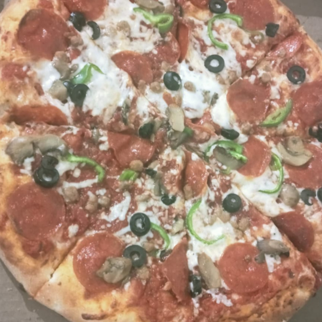 Pizza grande Suprema (Queso mozarella, peperoni, champiñones, aceitunas, chile, salchicha italiana)