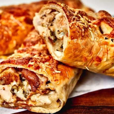 Rollo de pollo con tocino, cebolla y queso