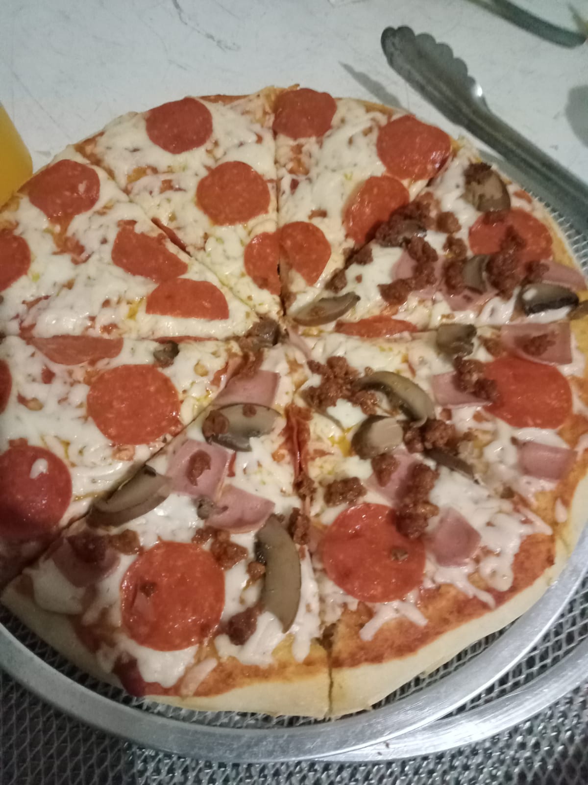 Queso mozzarella, mitad pepperoni, mitad pepperoni, champiñón, chorizo y jamón.