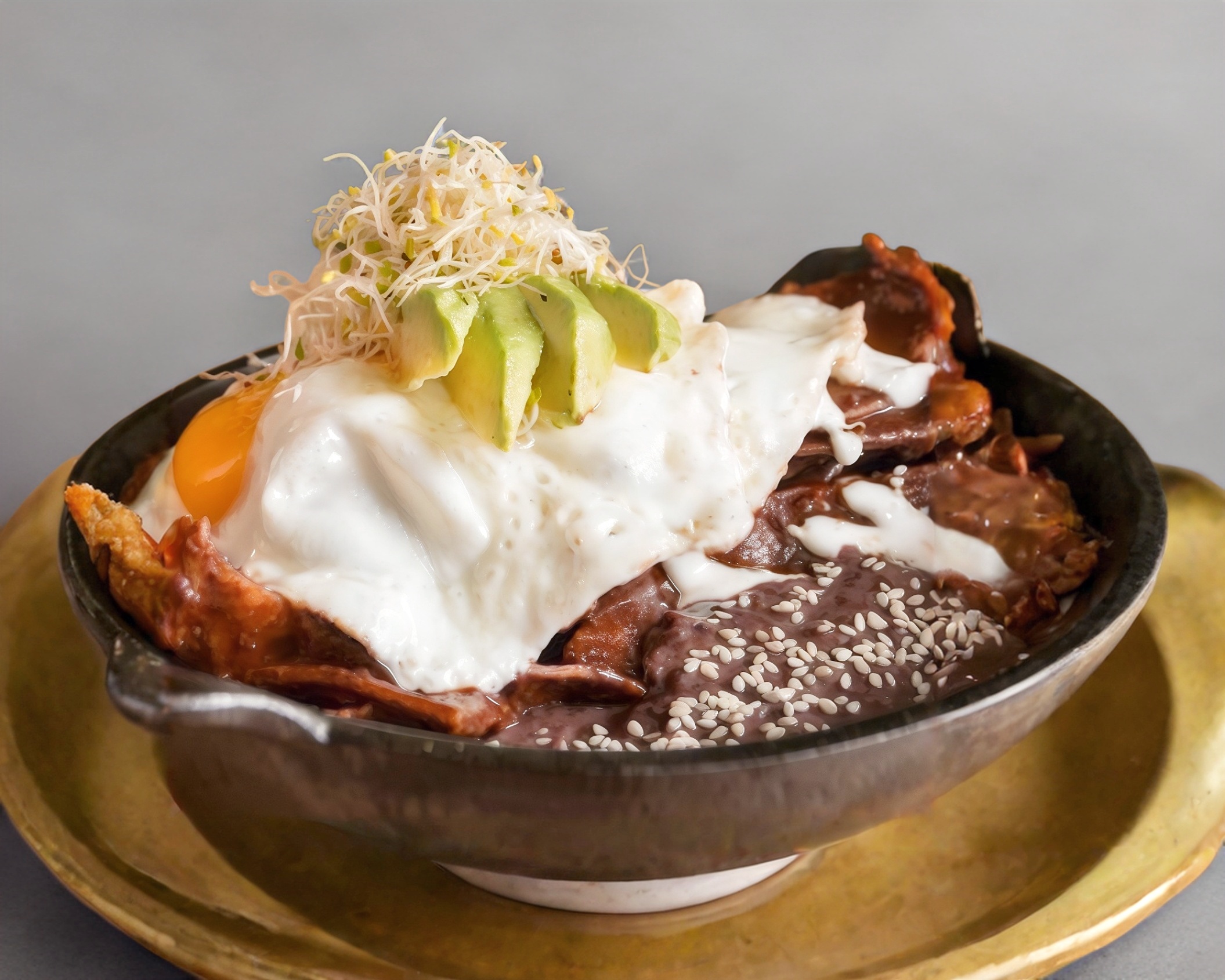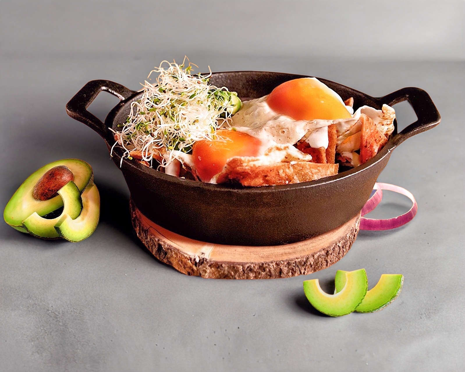 2 huevos orgánicos enteros, tomate, cebolla y aguacate. Acompañado de frijol negro y papa horneada.
