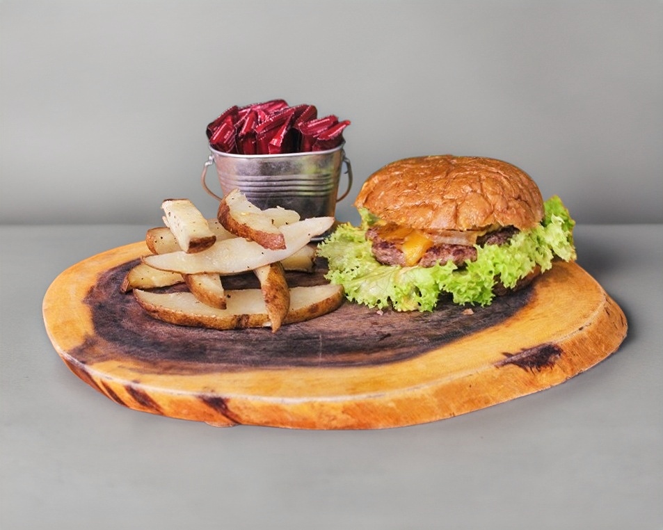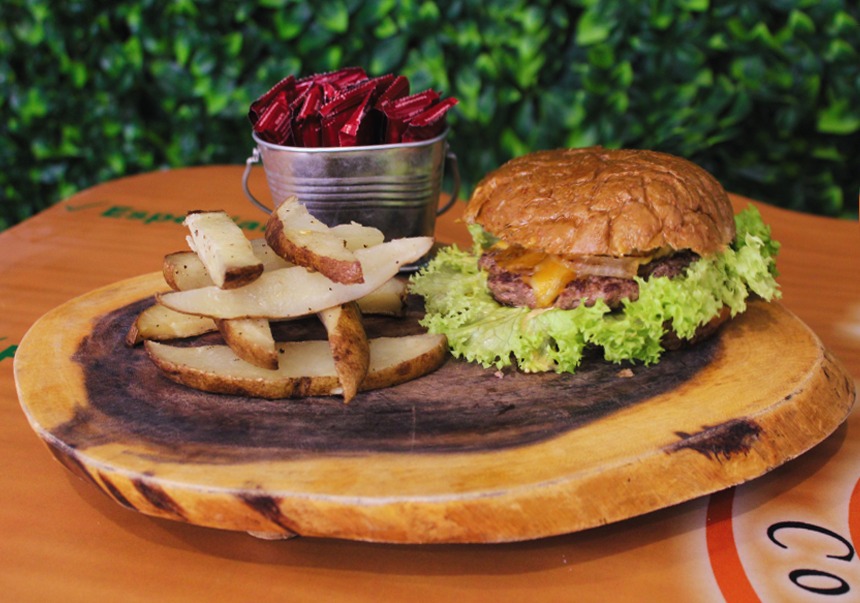 Pan de centeno, carne magra, lechuga hidropónica, queso cheddar, aguacate, tomate y cebolla caramelizada. Acompañado de papas al horno o camote.