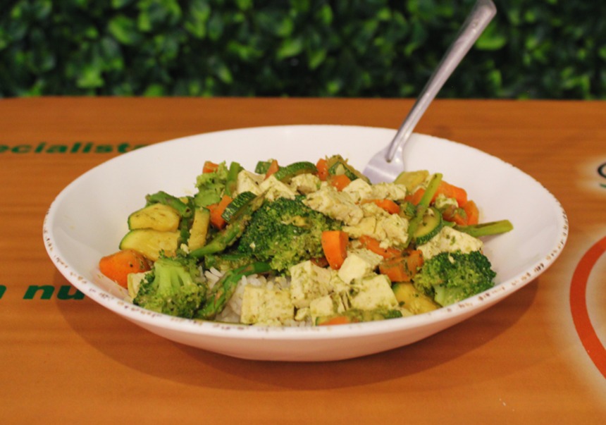 Cama de arroz, con brocoli, esparrago, zanahoria, calabaza, tomate cherry, tofu organico (150gr) y aderezo pesto