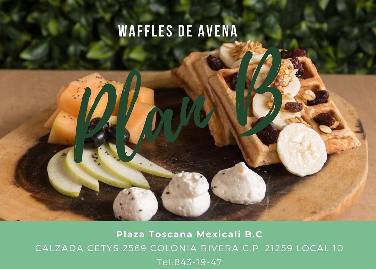 Waffles con proteína, espinaca, aguacate. Acompañados de fruta de temporada.