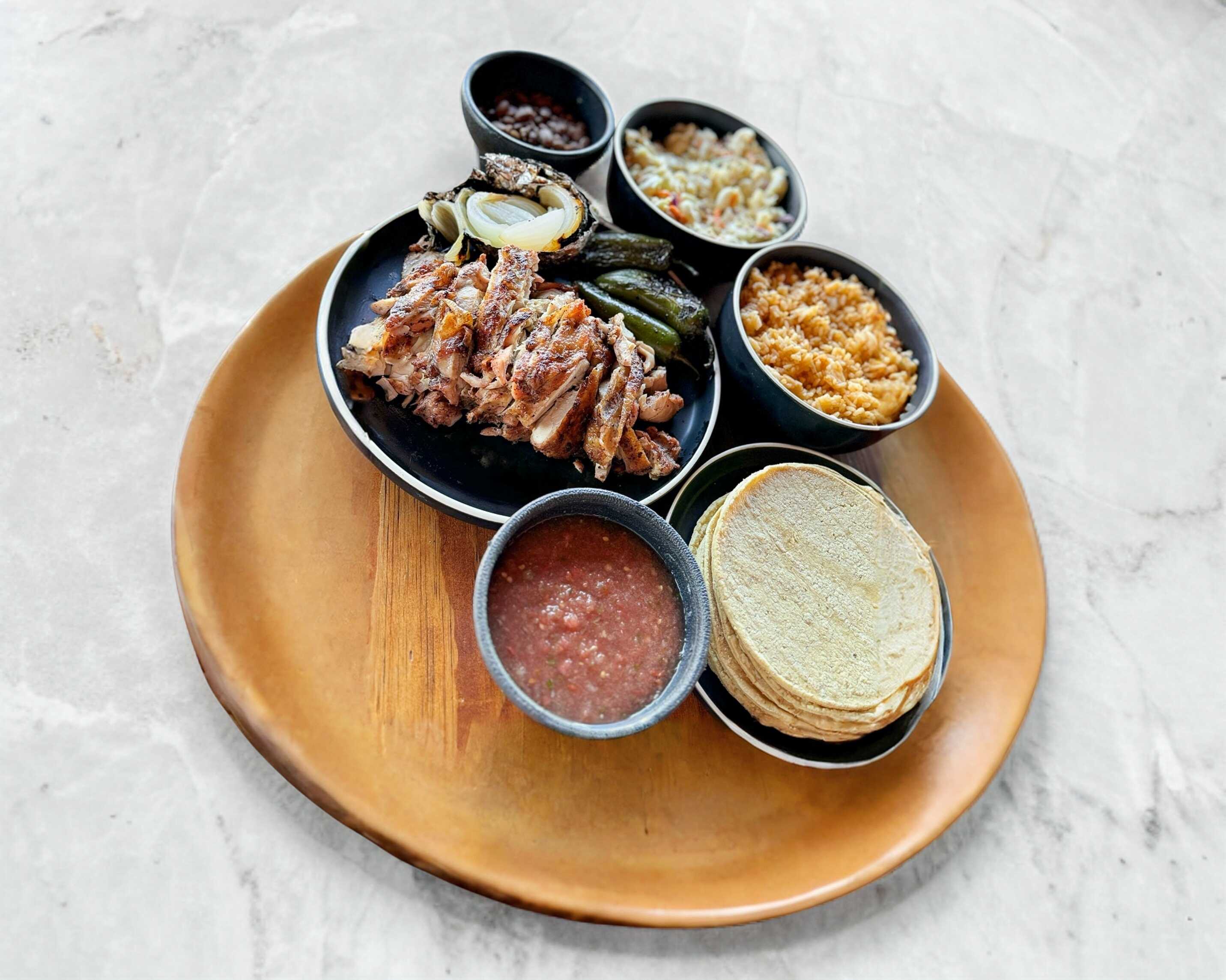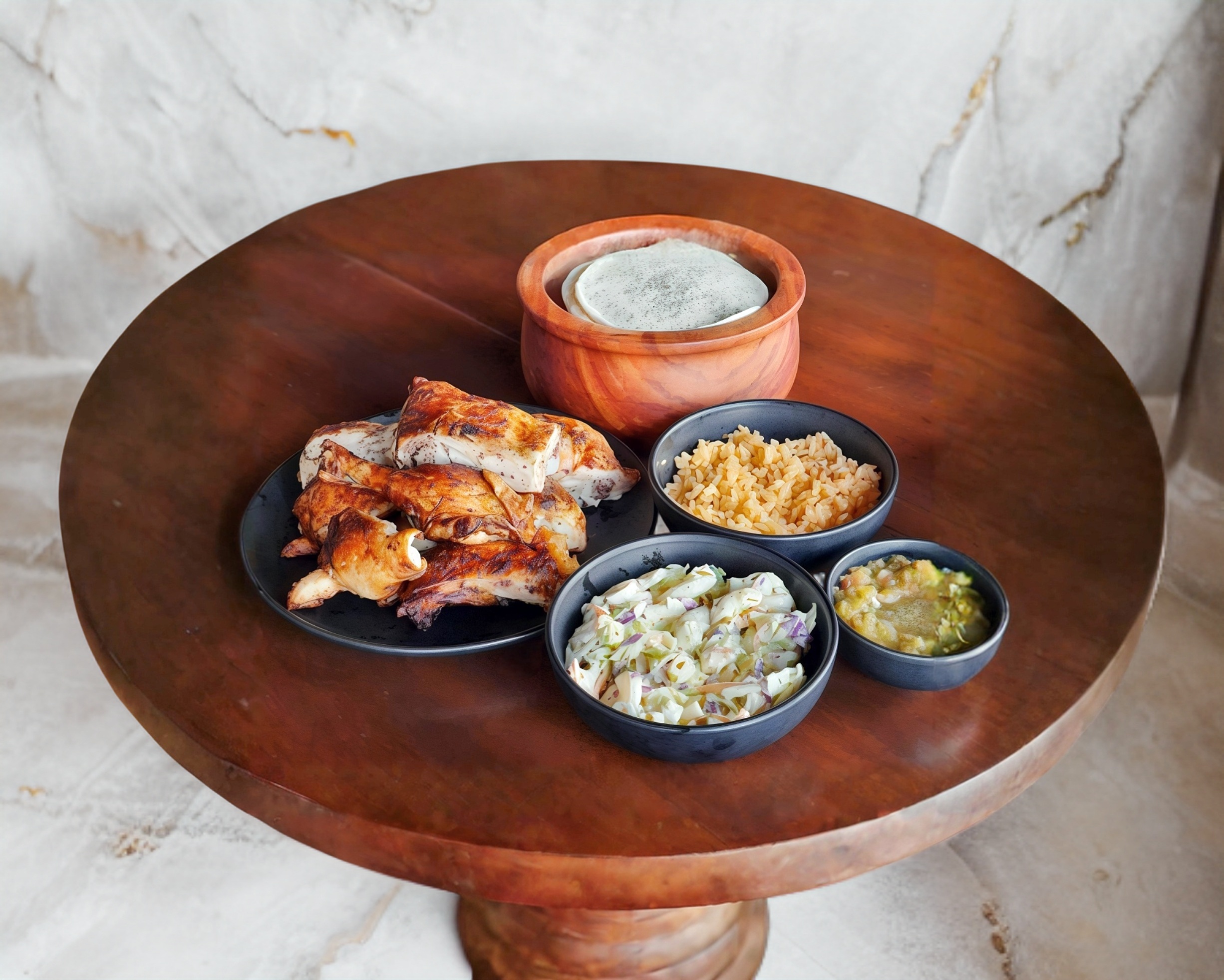 1/2 pollo deshuesado,arroz,ensalada,salsa y tortillas