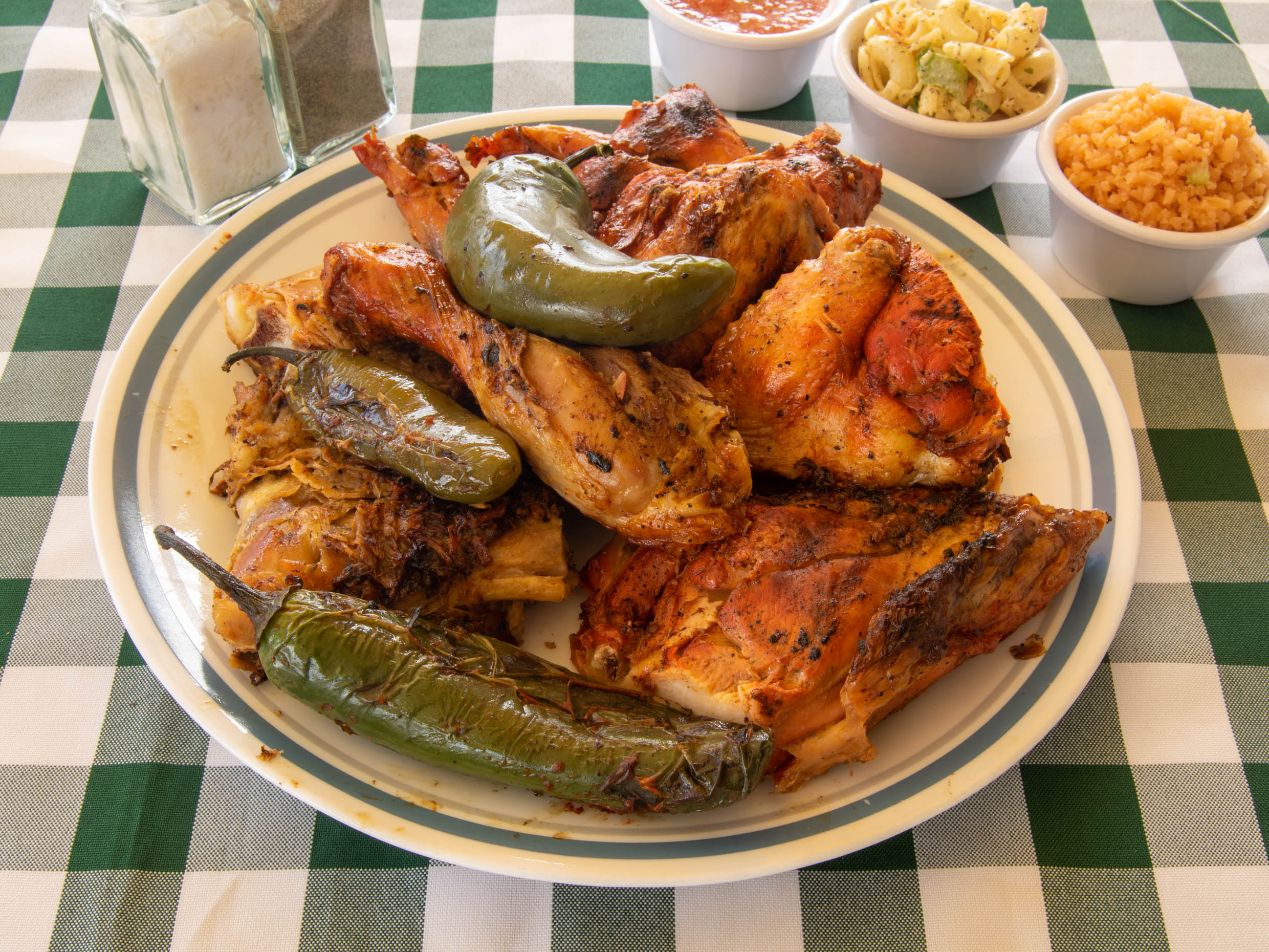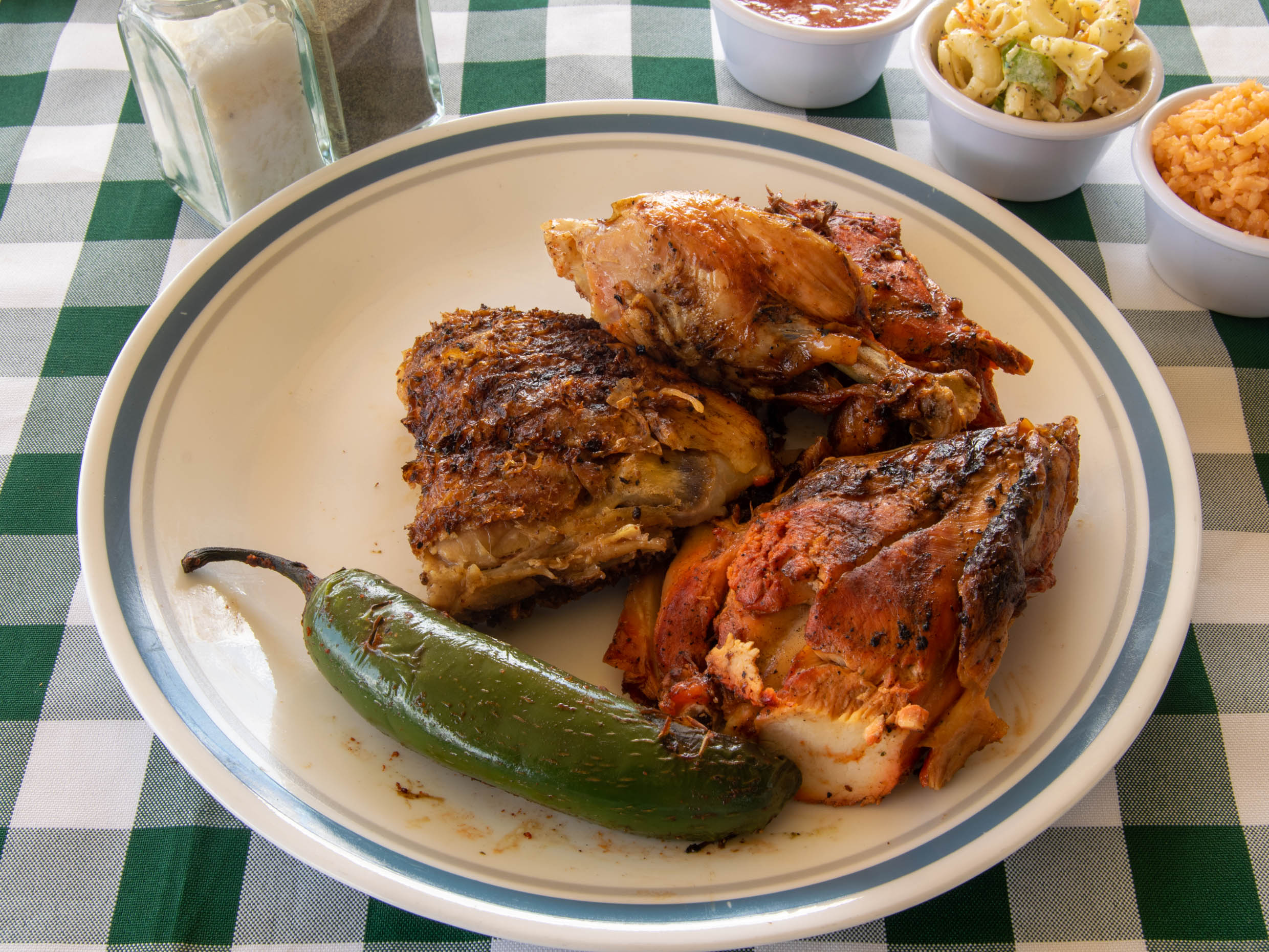 1/2 Pollo incluye arroz, ensalada, frijoles, tortillas y chiles asados.