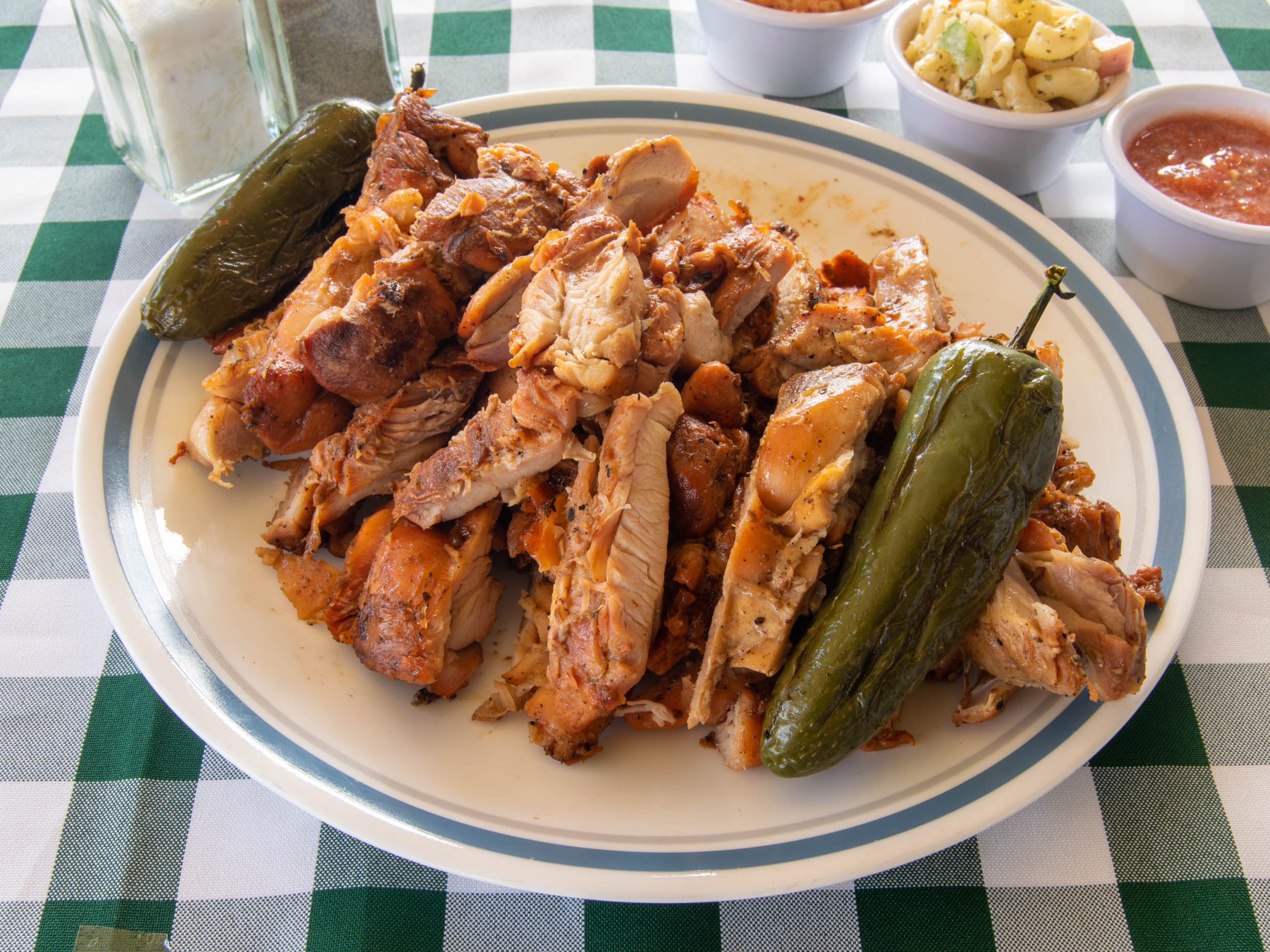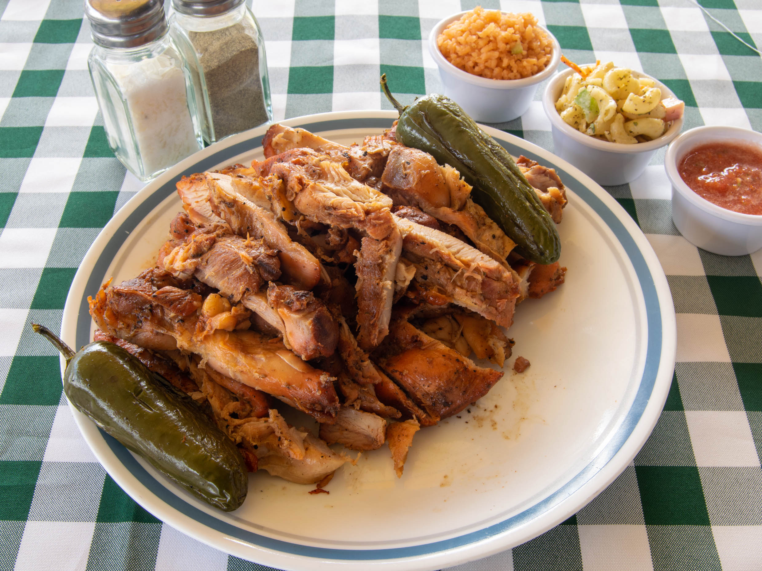 1/2 Orden de pollo deshuesado, incluye arroz, ensalada, frijoles, salsa, tortillas y chiles asados.