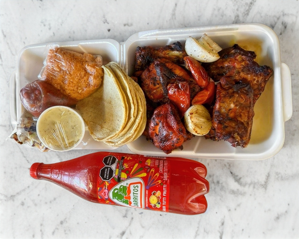 Medio pollo arroz ensalada salsa tortillas chiles asados cebollas