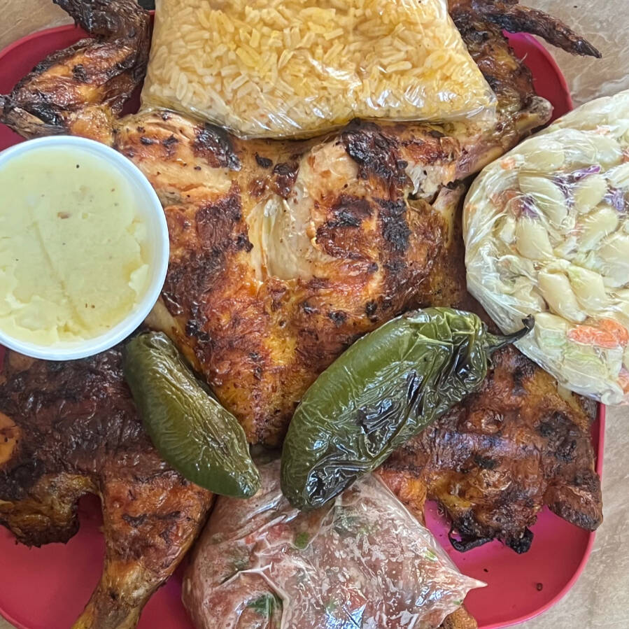 Pollo entero acompañado ensalada, arroz,puré, salsa, chiles y cebollas asadas, tortillas