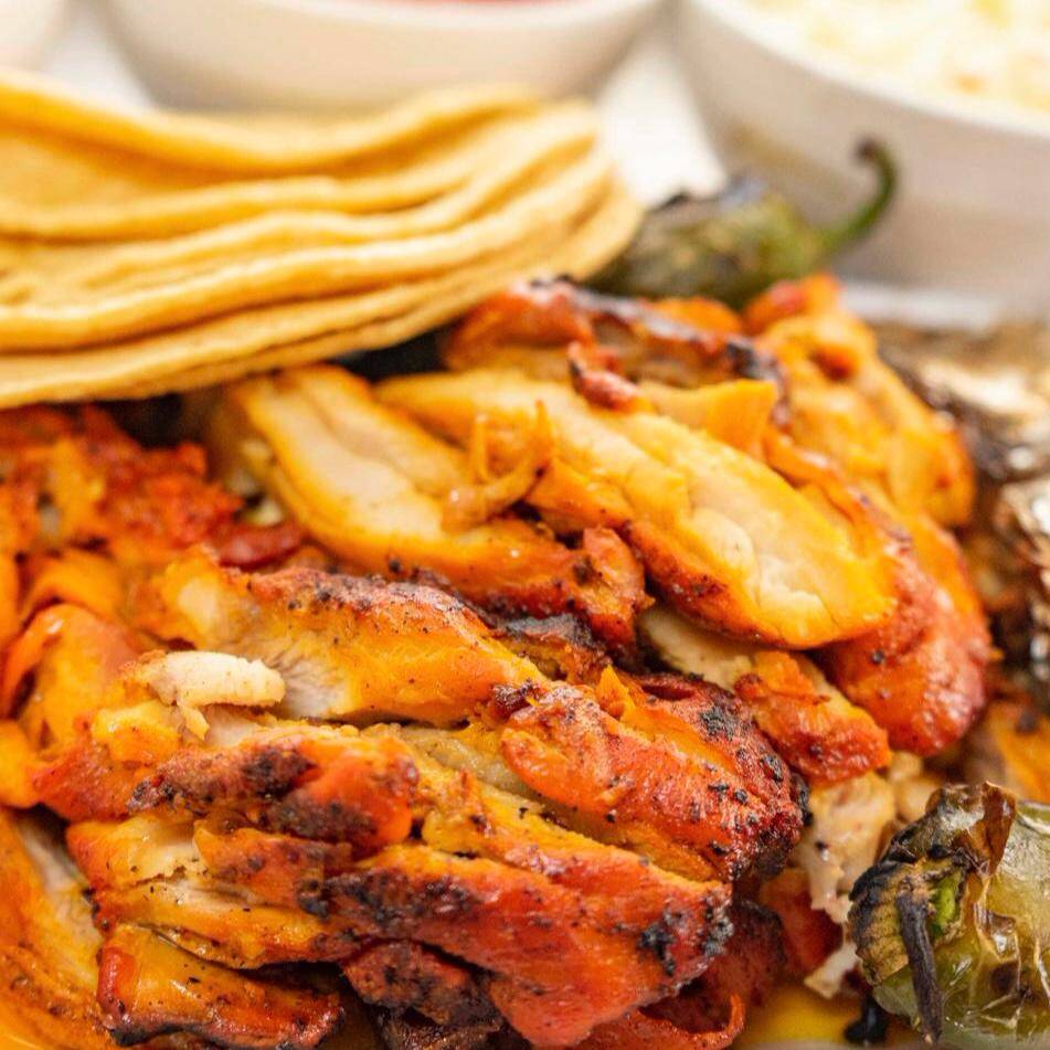 Incluye salsa, ensalada, tortillas, arroz, chile y cebolla