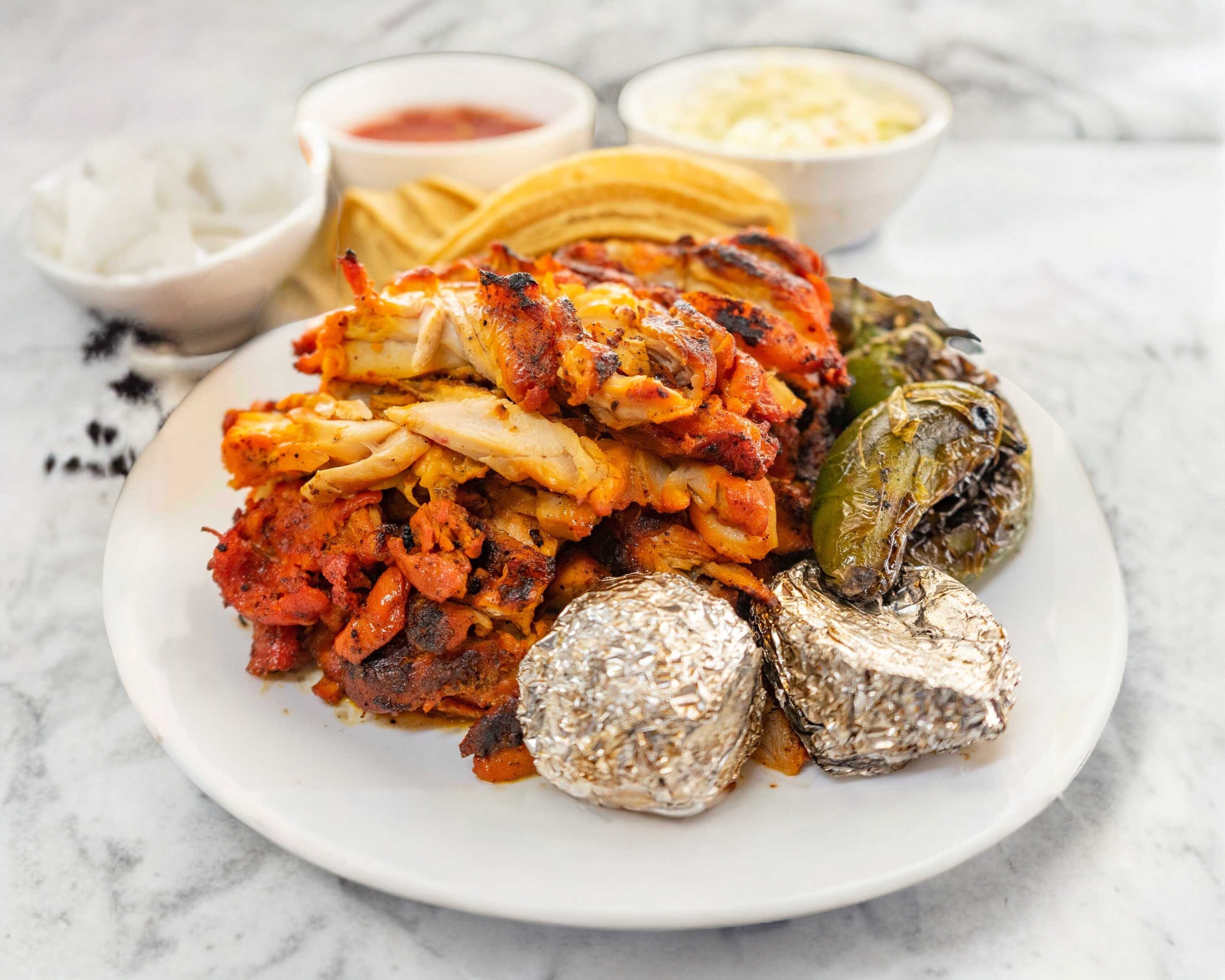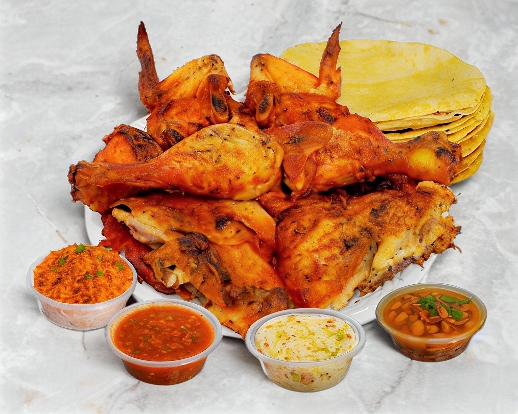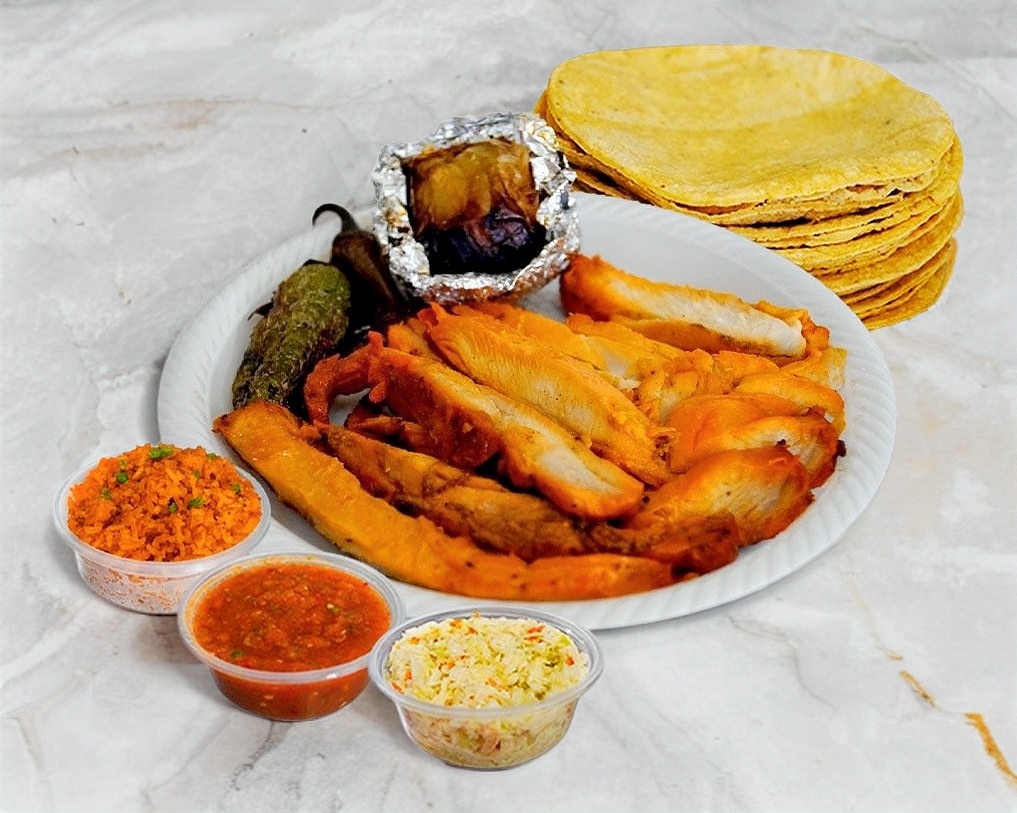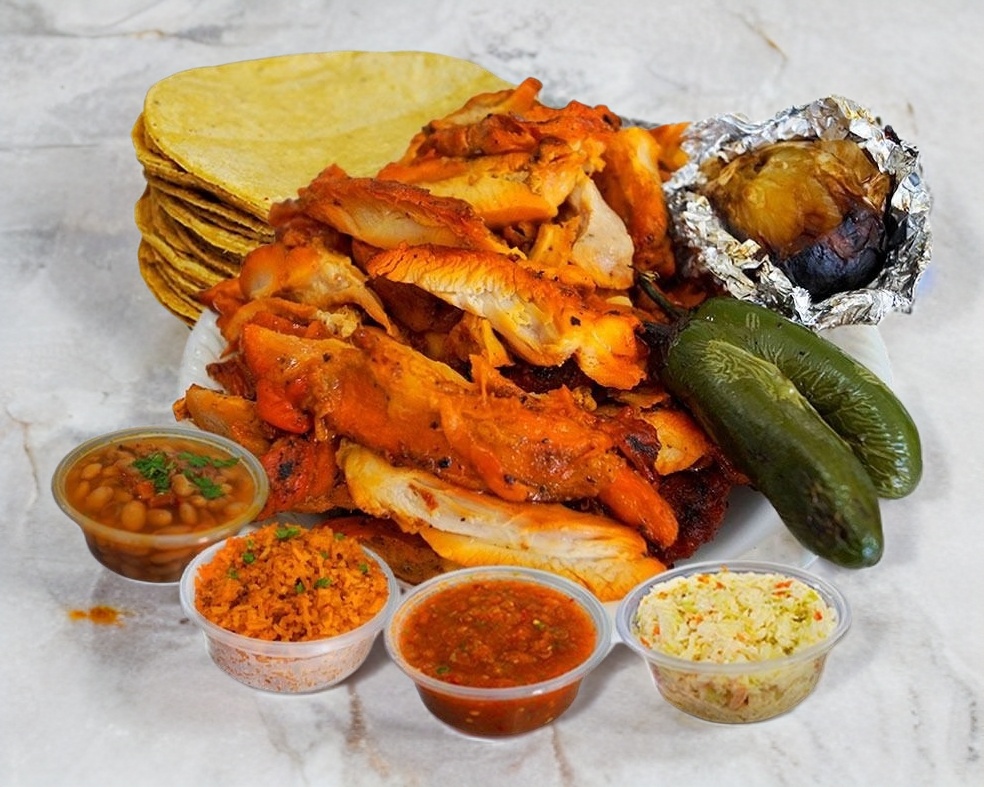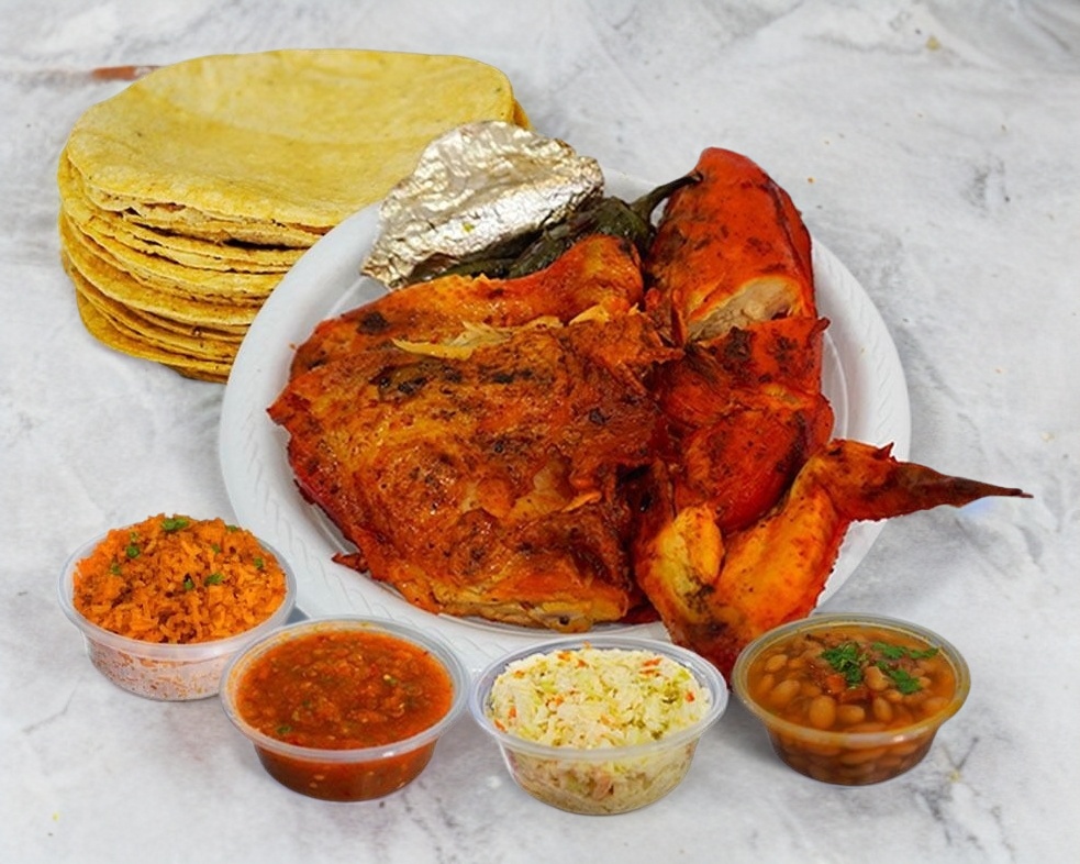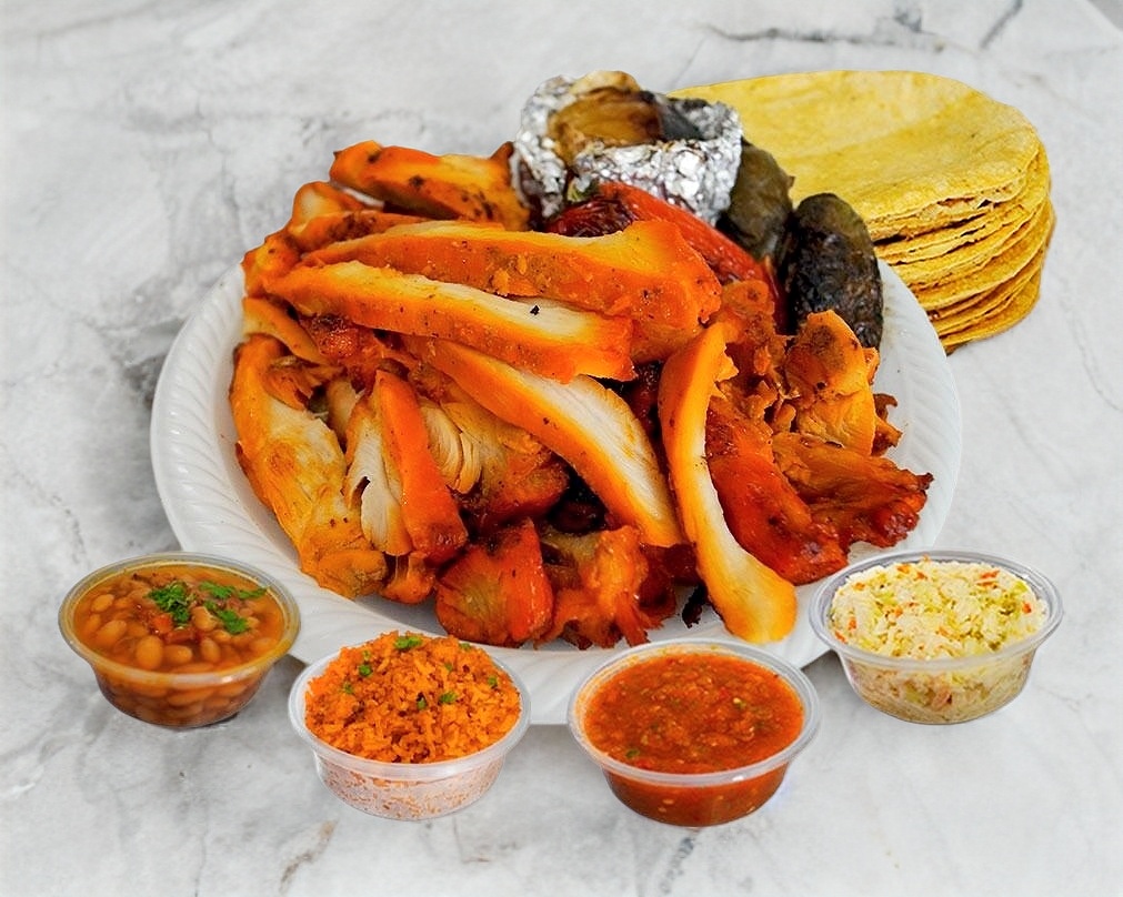 1 Pollo Asado, Incluye salsa roja, ensalada de repollo, arroz anaranjado, frijoles charros, tortillas de maíz, chiles y cebollas