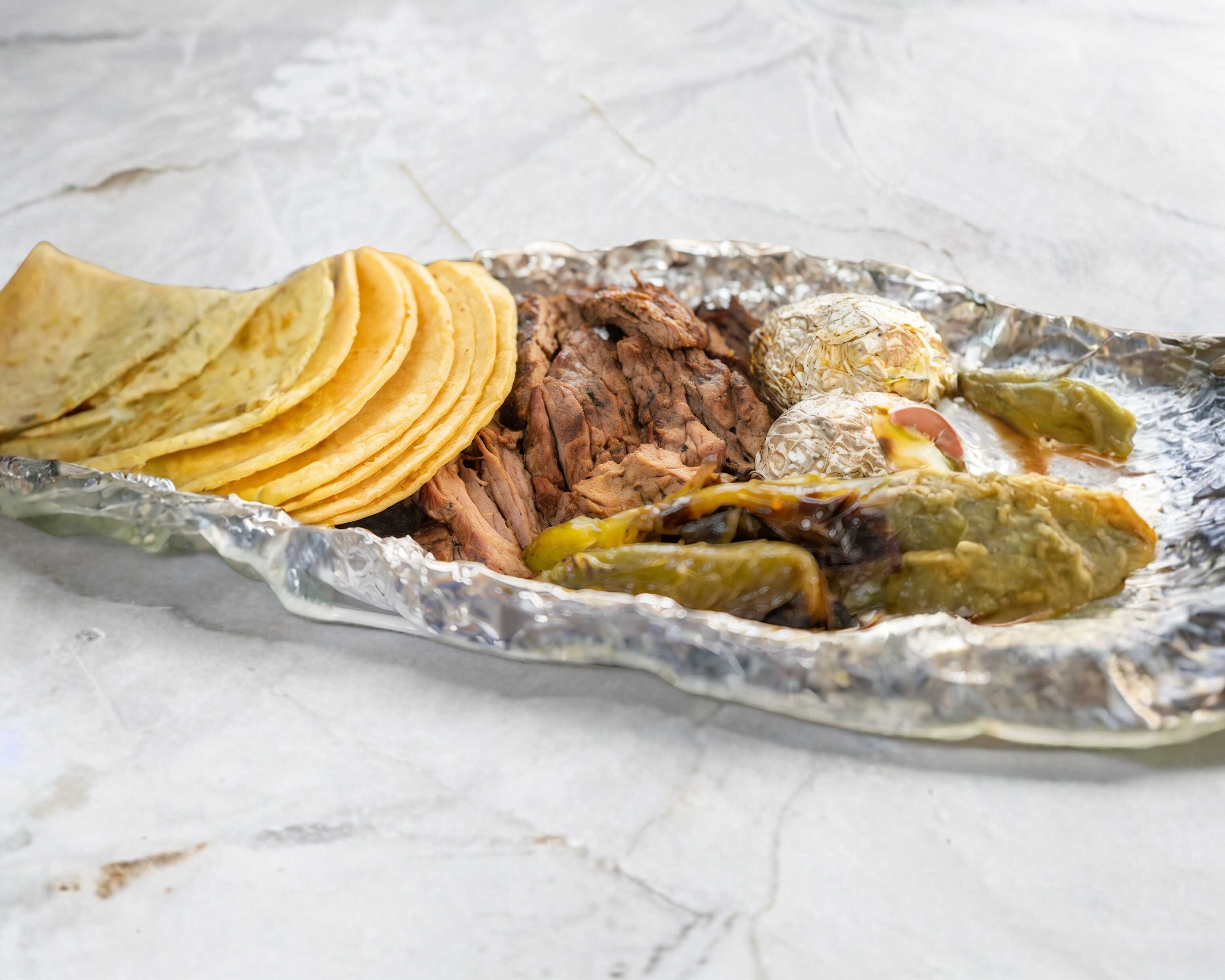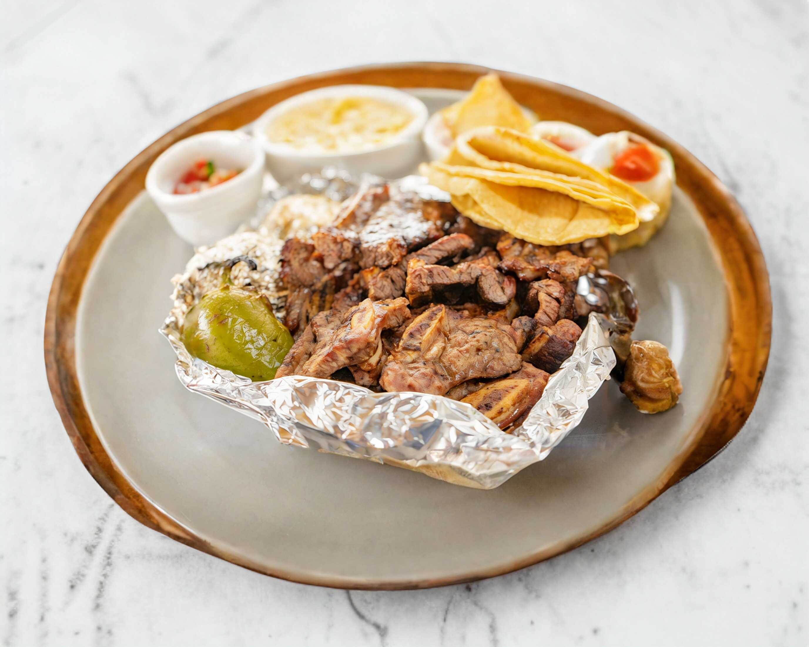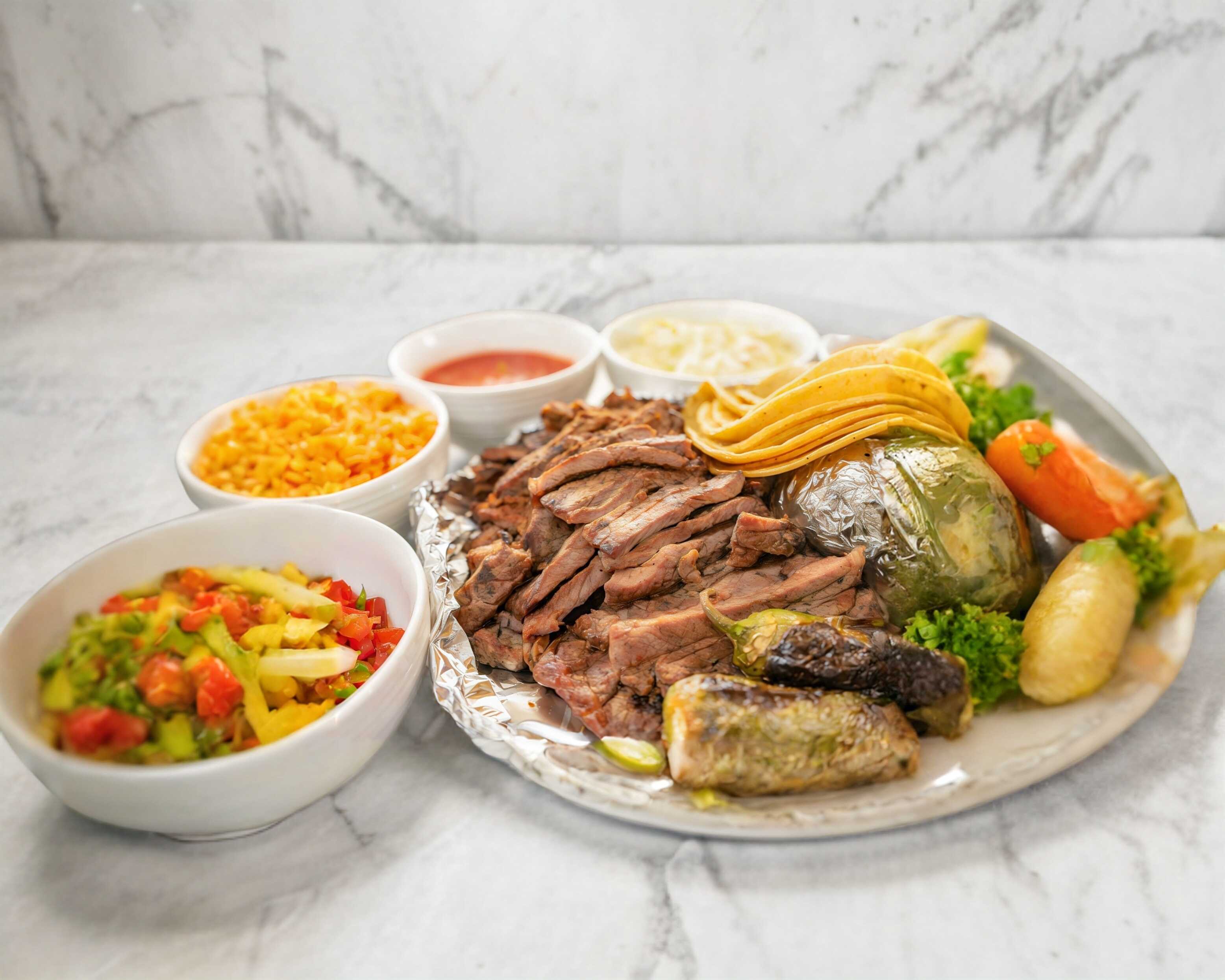 Incluye 2 guarniciones de salsa, ensalada, arroz, frijoles, chiles, cebollas y tortillas