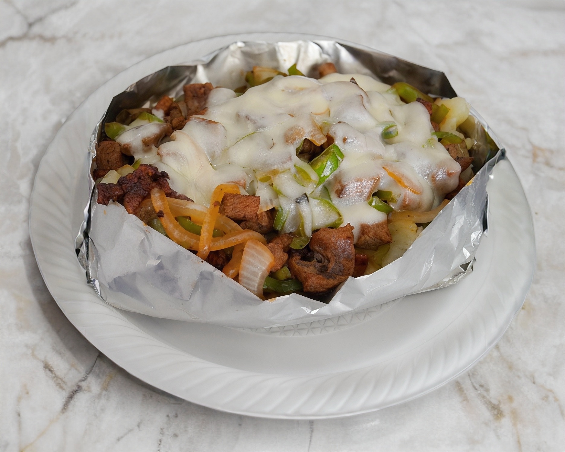 Deliciosa papa rellena de carne, tocino, chile california, cebolla y queso.