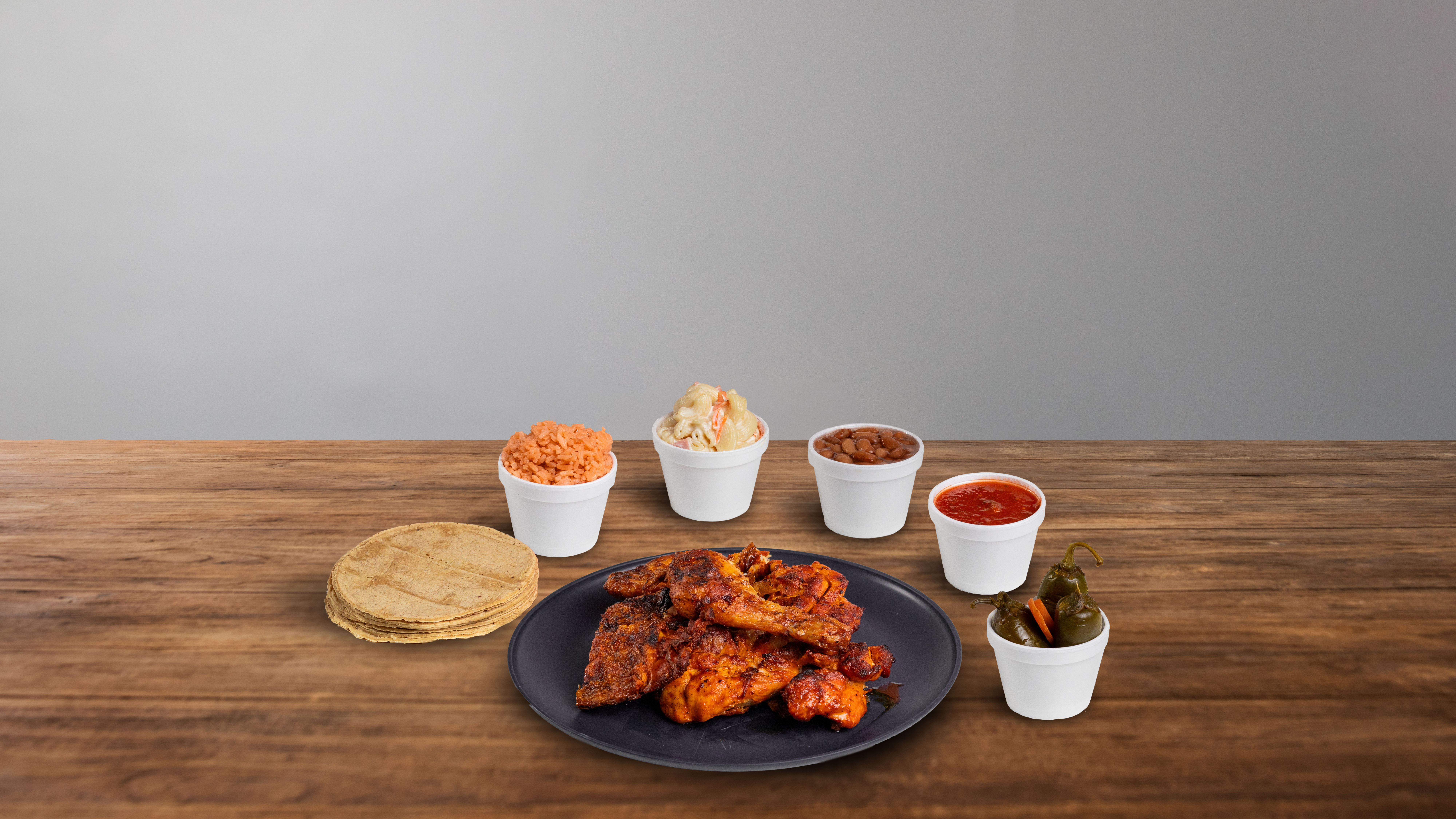 1/4 De pollo deshuesado acompañado de arroz, salsa, tortillas y frijoles.
