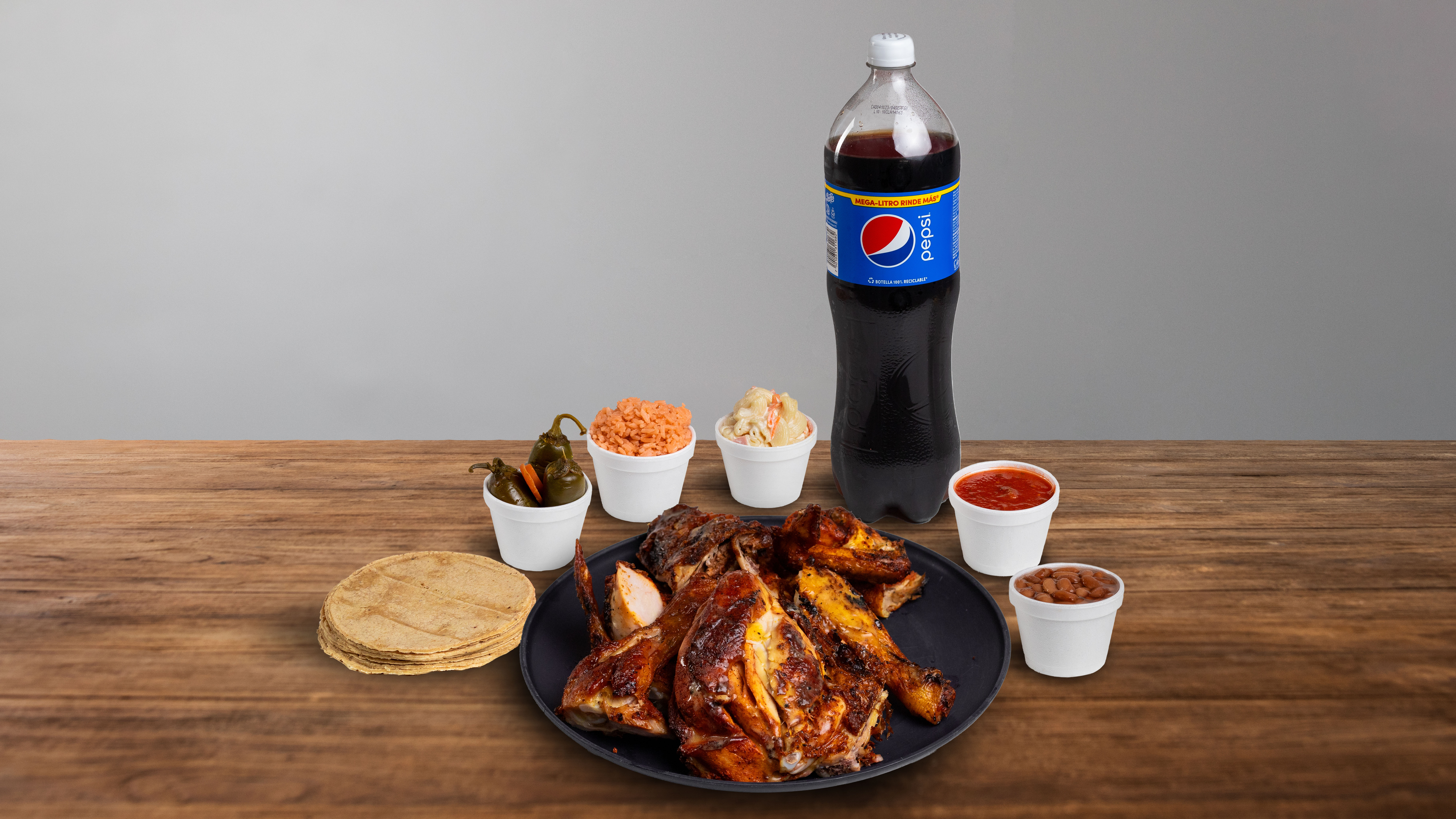 1 Pollo entero acompañado de frijol, salsa, tortillas, ensalada, arroz más refresco 1.5 litros.