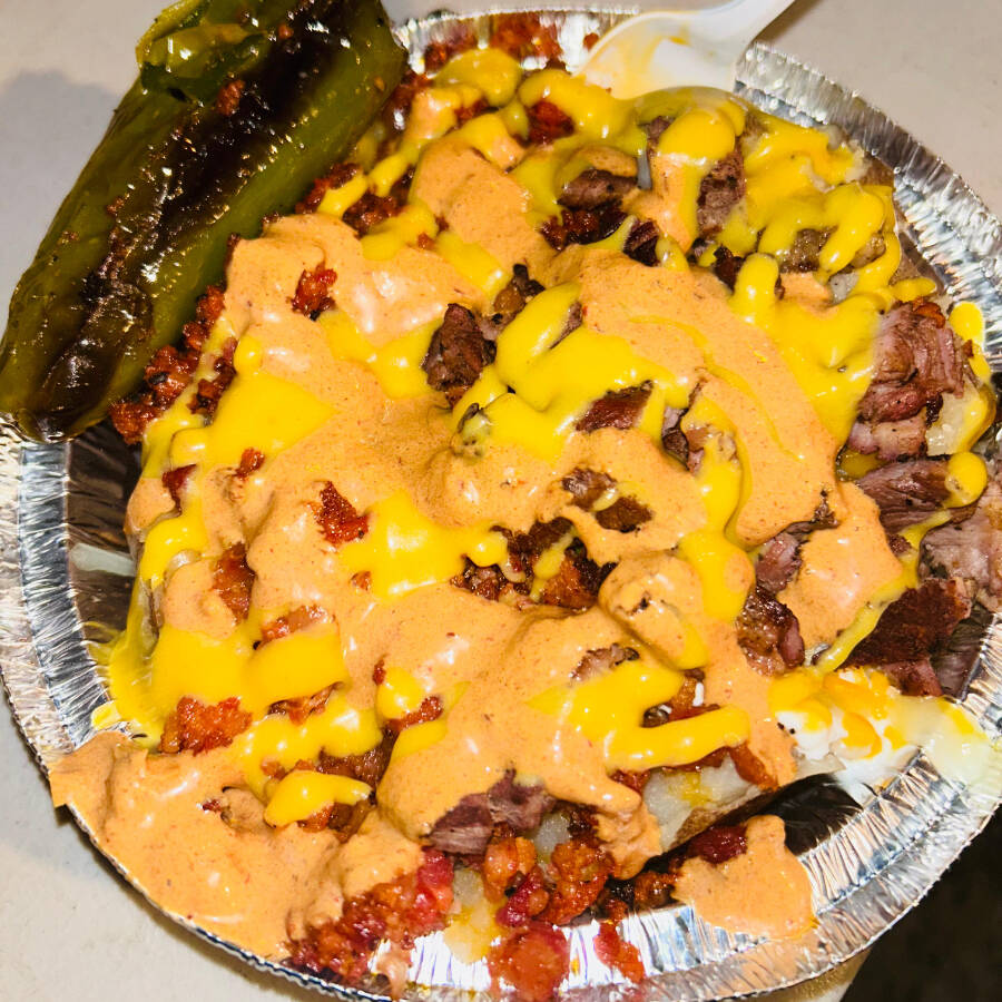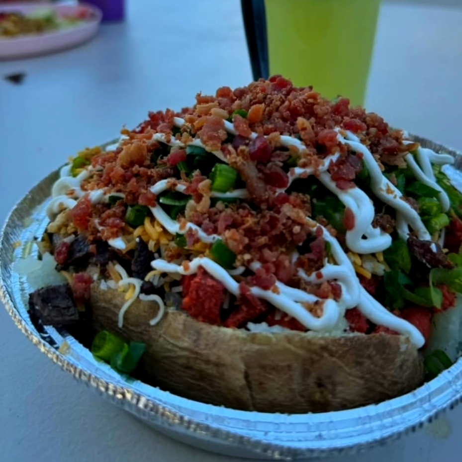 Papa al horno cubierta con nuestra suabe mantequilla, con Carne asada, tocino y chorizo español