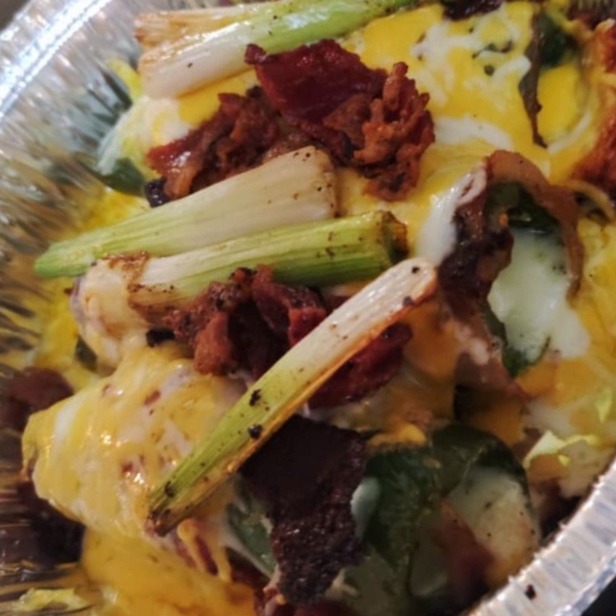 3 chiles rellenos con quesos de la casa (filadelphia, mozarella) con un toping de tocino, gratinados en quesos (mozarella, cheedar)