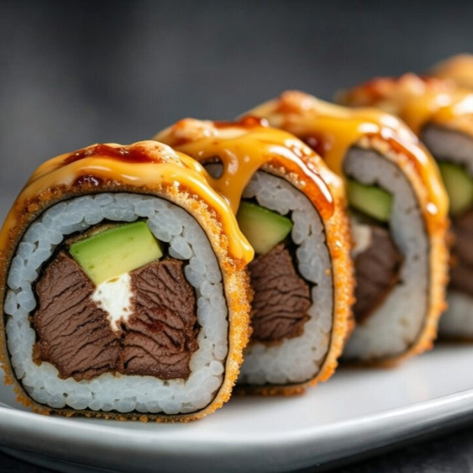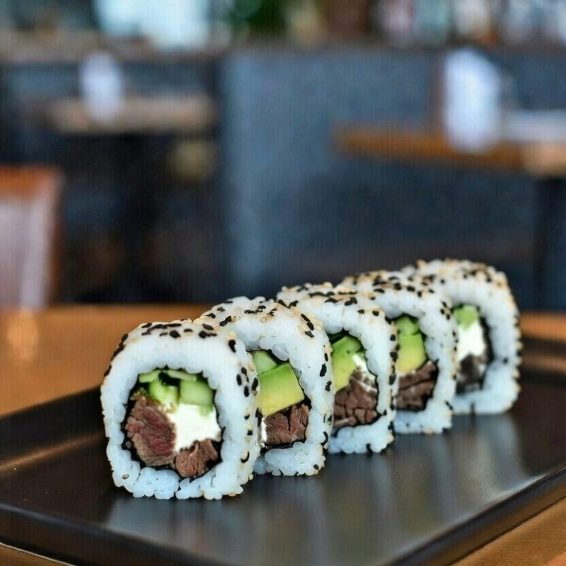 Carne asada jugosa a la plancha, queso fundido derretido por encima + Philadelphia adentro, aguacate y pepino. Toque de salsa norteña.