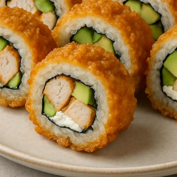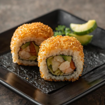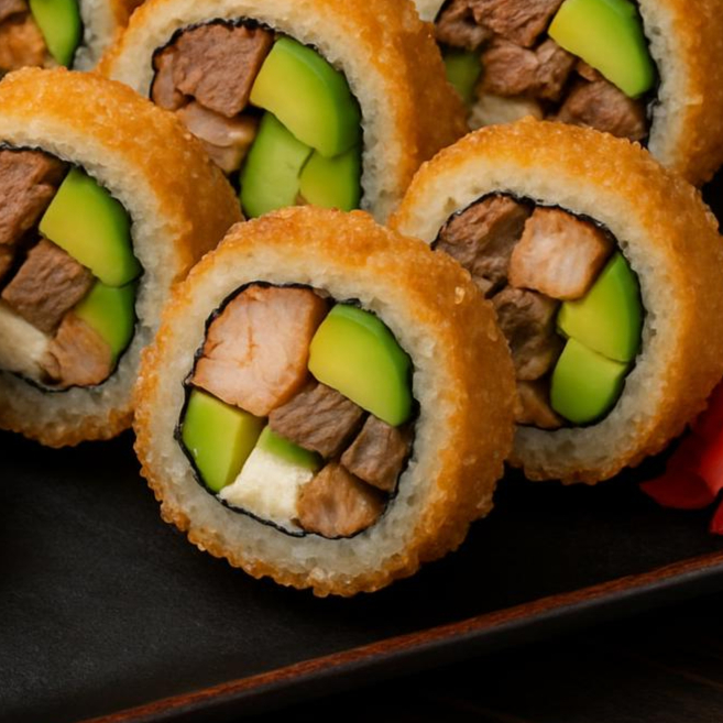 Camarón cocido, pollo a la plancha, carne a la plancha y Philadelphia, aguacate y pepino. Empanizado y frito crujiente.