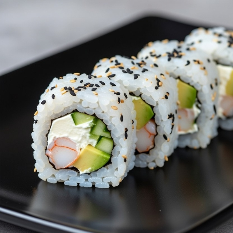 Camarón cocido, queso Philadelphia, aguacate, alga y pepino. Empanizado crujiente.