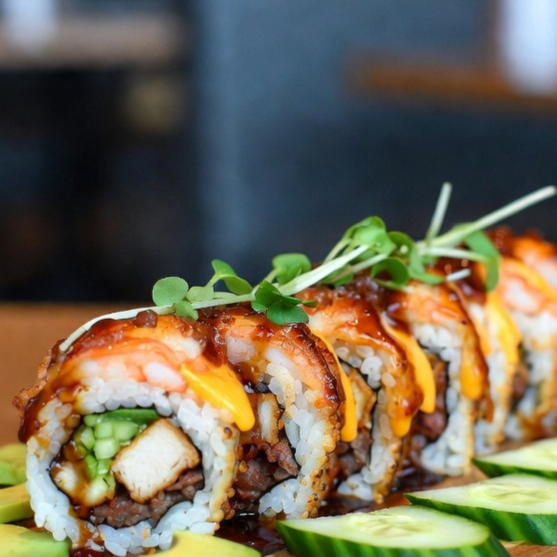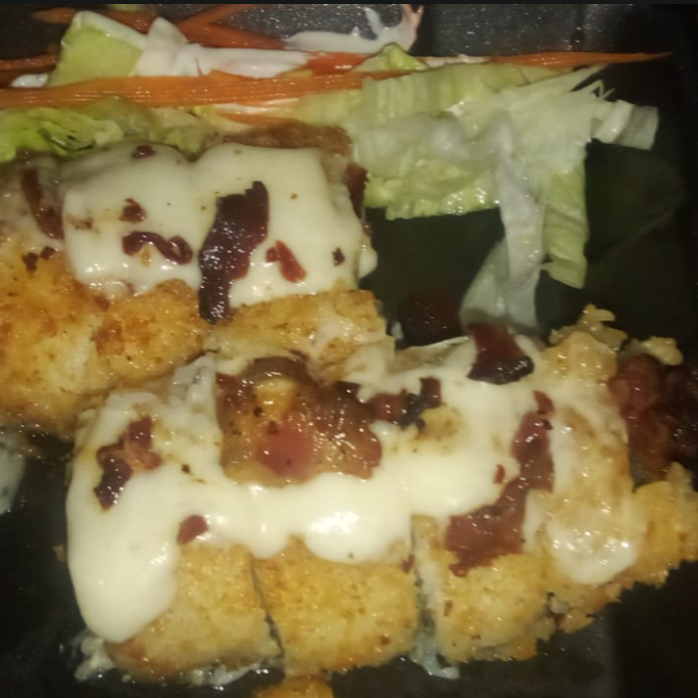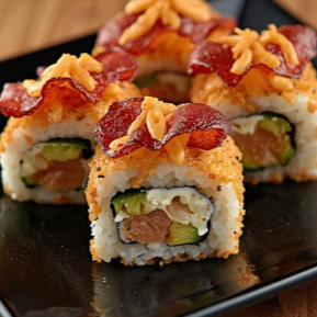Bacon crujiente, camarón cocido, queso Philadelphia adentro alga, aguacate y pepino. Empanizado, terminado con queso fundido derretido por encima y salsa picante.