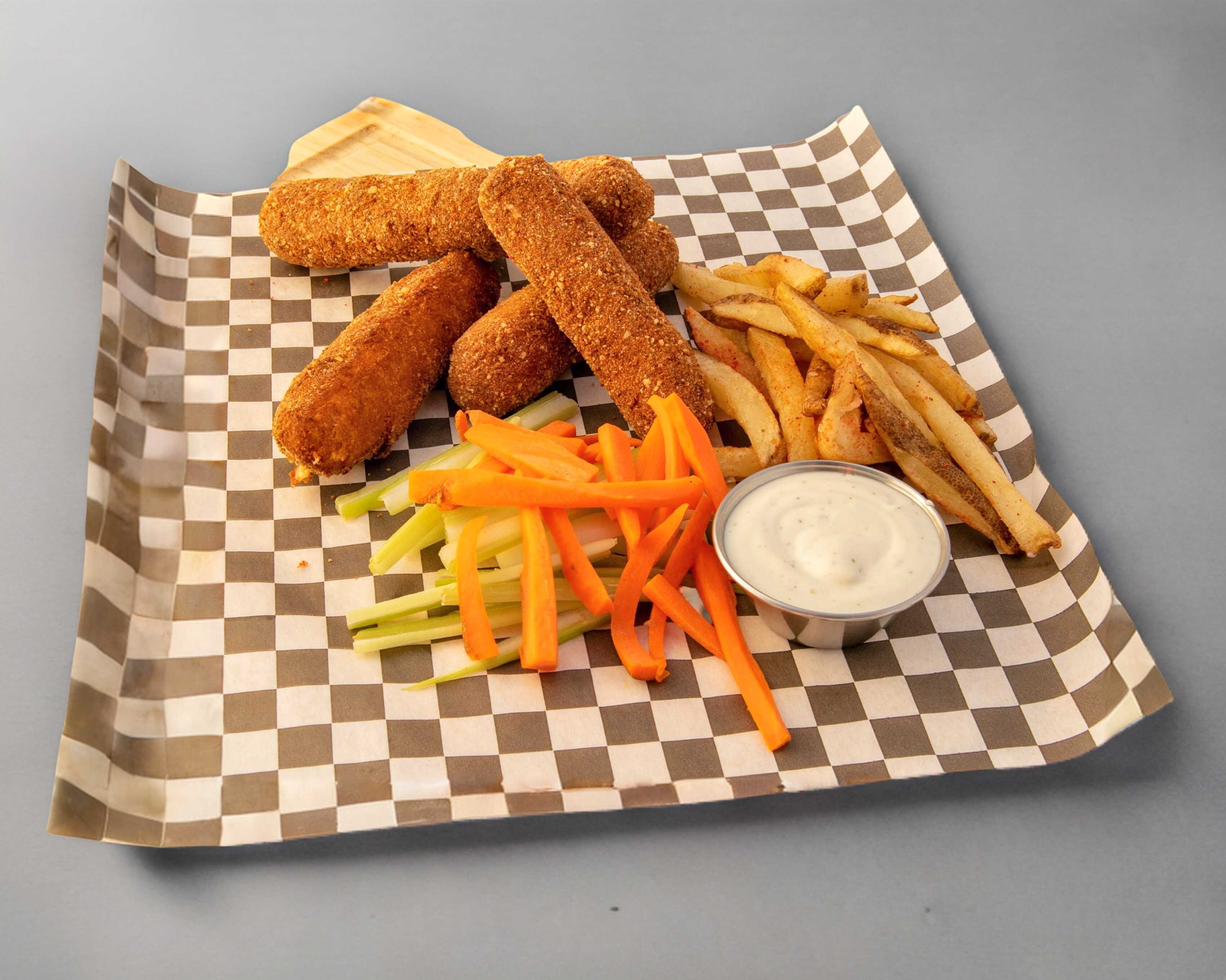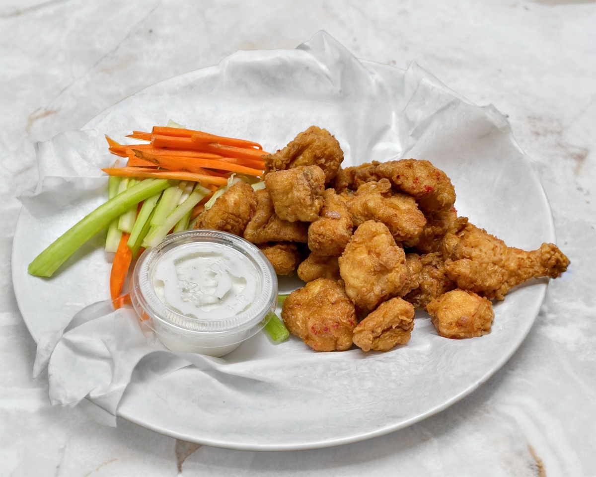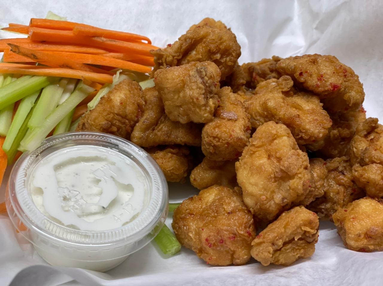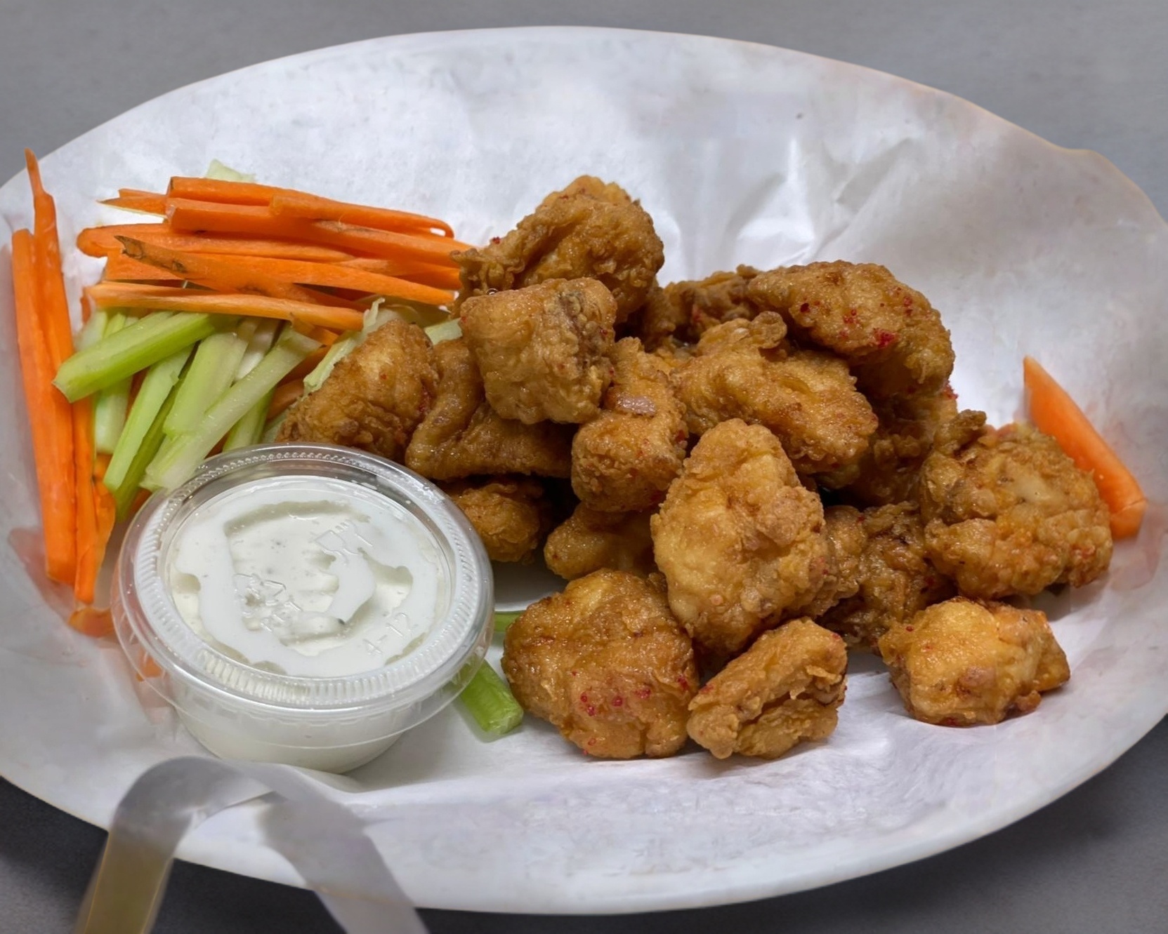 Pechuga de pollo fresca, para elaborar al momento los boneless, salsa a elegir, zanahoria, apio, ranch, acompañado con papas fritas.