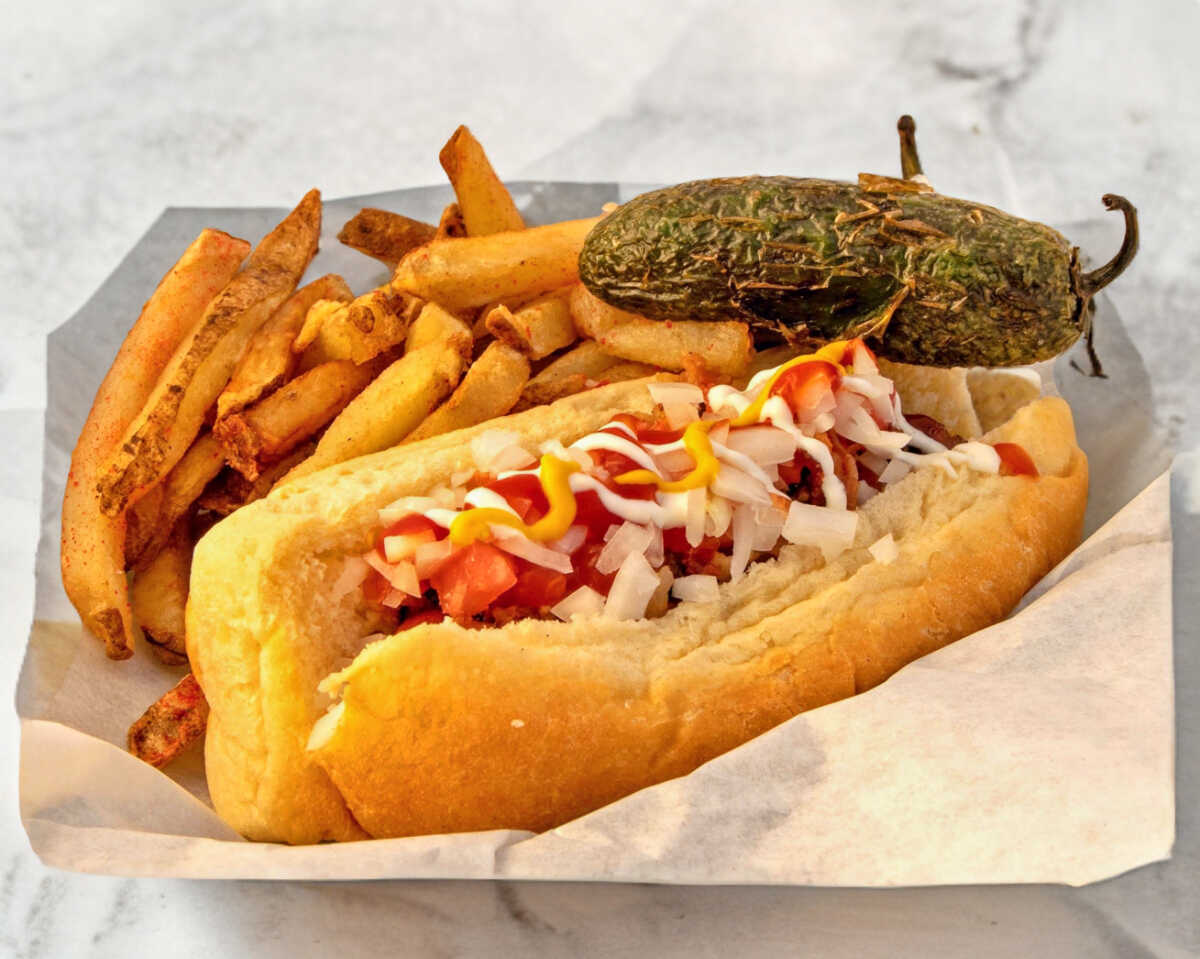 Pan 12 granos, boneless con la salsa a elegir, jamón, tocino, queso, lechuga, tomate, cebolla y viene acompañado de papas fritas.
