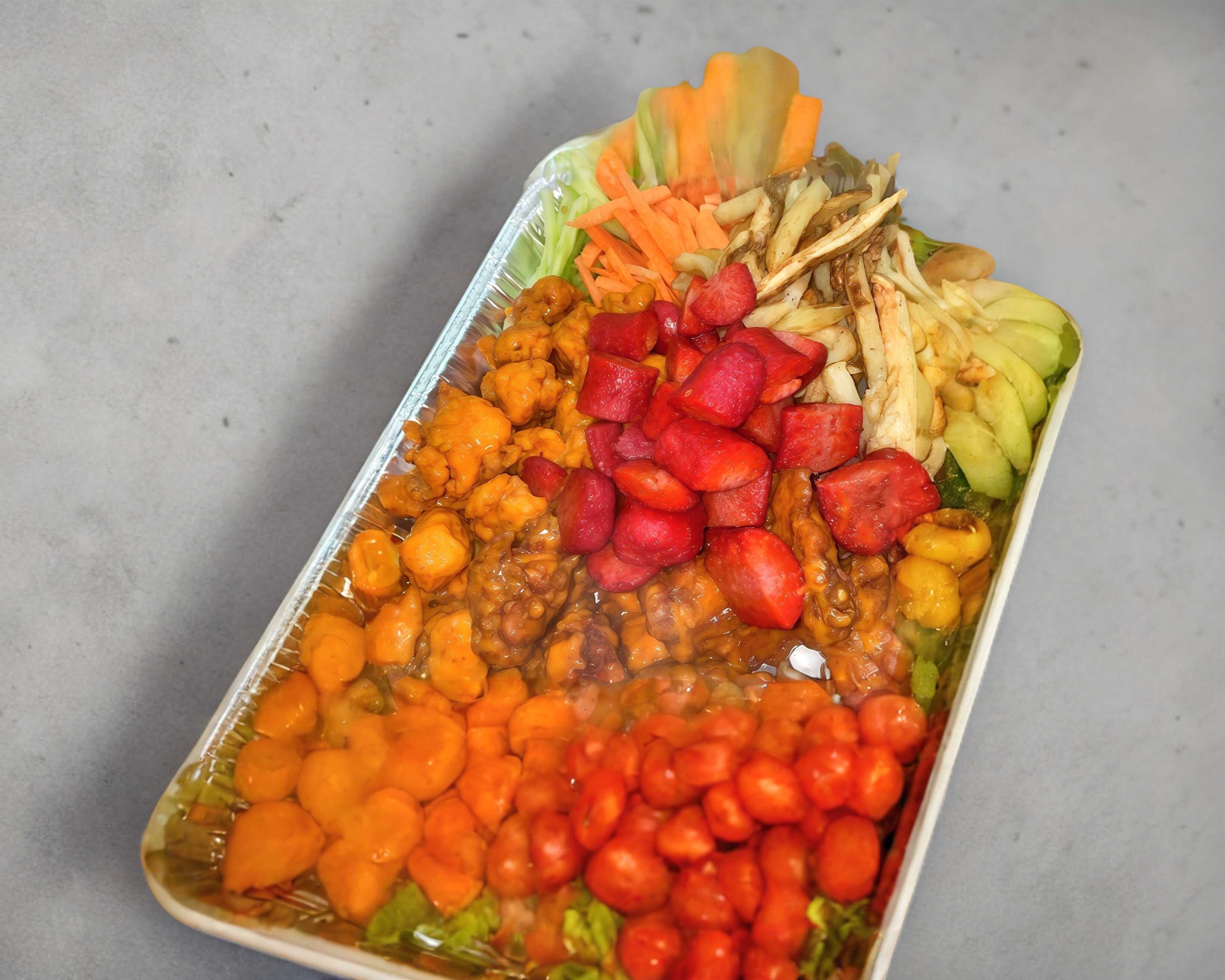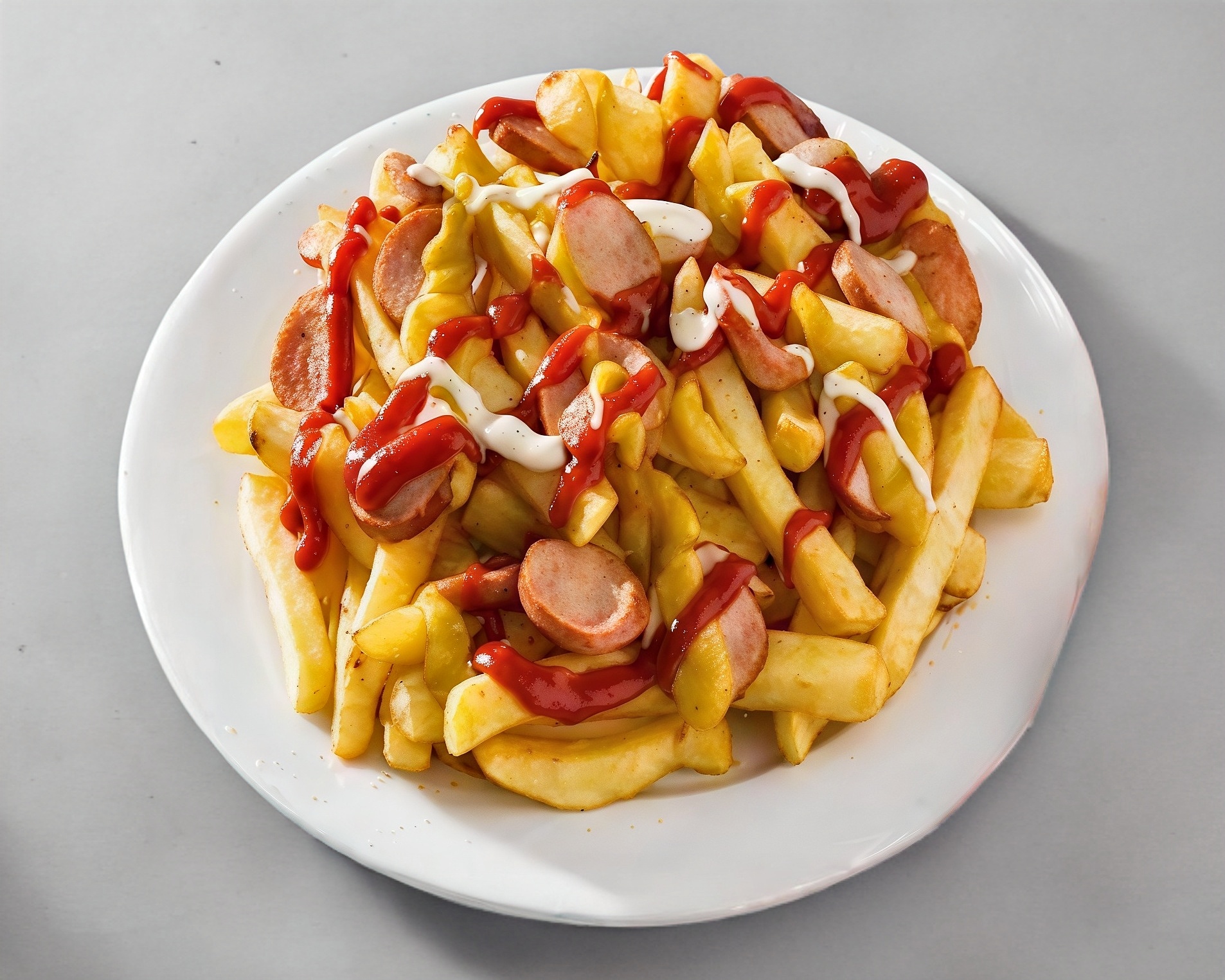 Base de papas fritas, boneless bañados de salsas búffalo y BBQ, queso para nachos, tocino y queso monterrey.