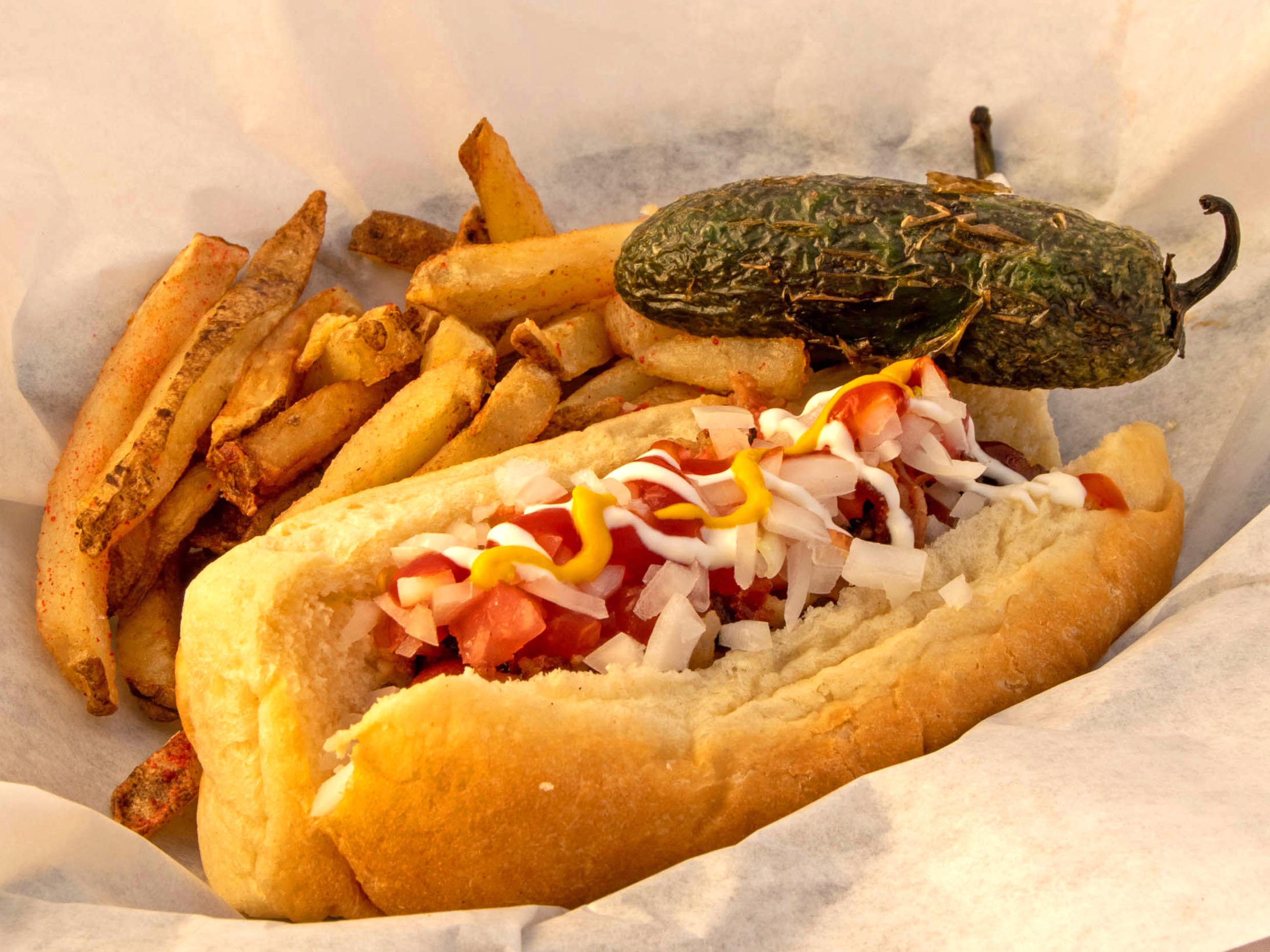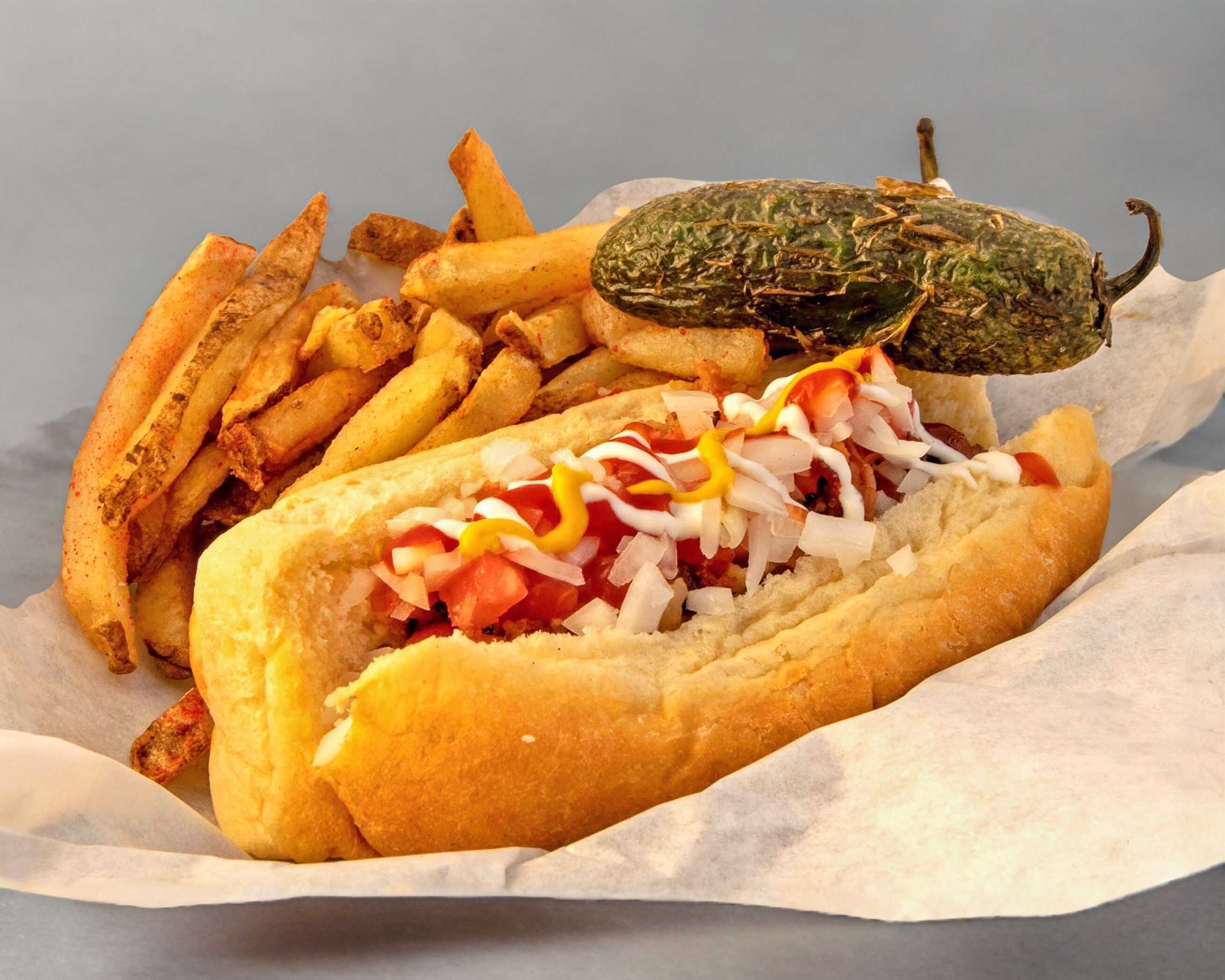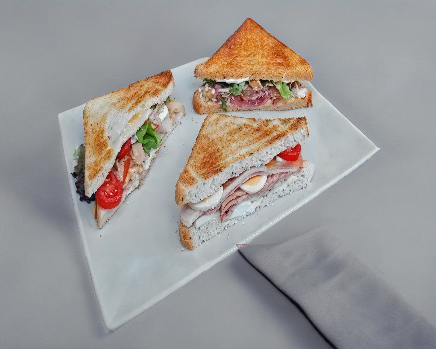 Pan 12 granos, jamón de pavo, pechuga de pollo, tocino, queso americano, queso manchego, lechuga, tomate, cebolla y aderezo chipotle, acompañado con papas fritas.