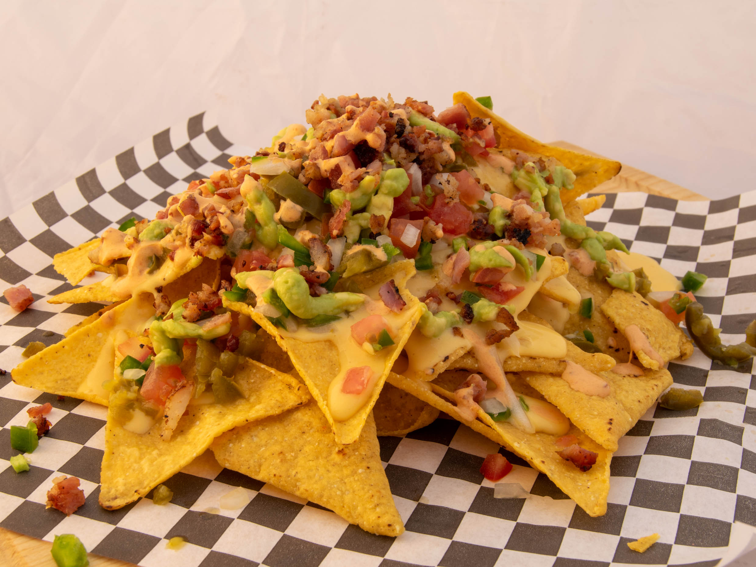 Totopos, queso amarillo, chilli beans, tocino, guacamole, salsa bandera y jalapeños.