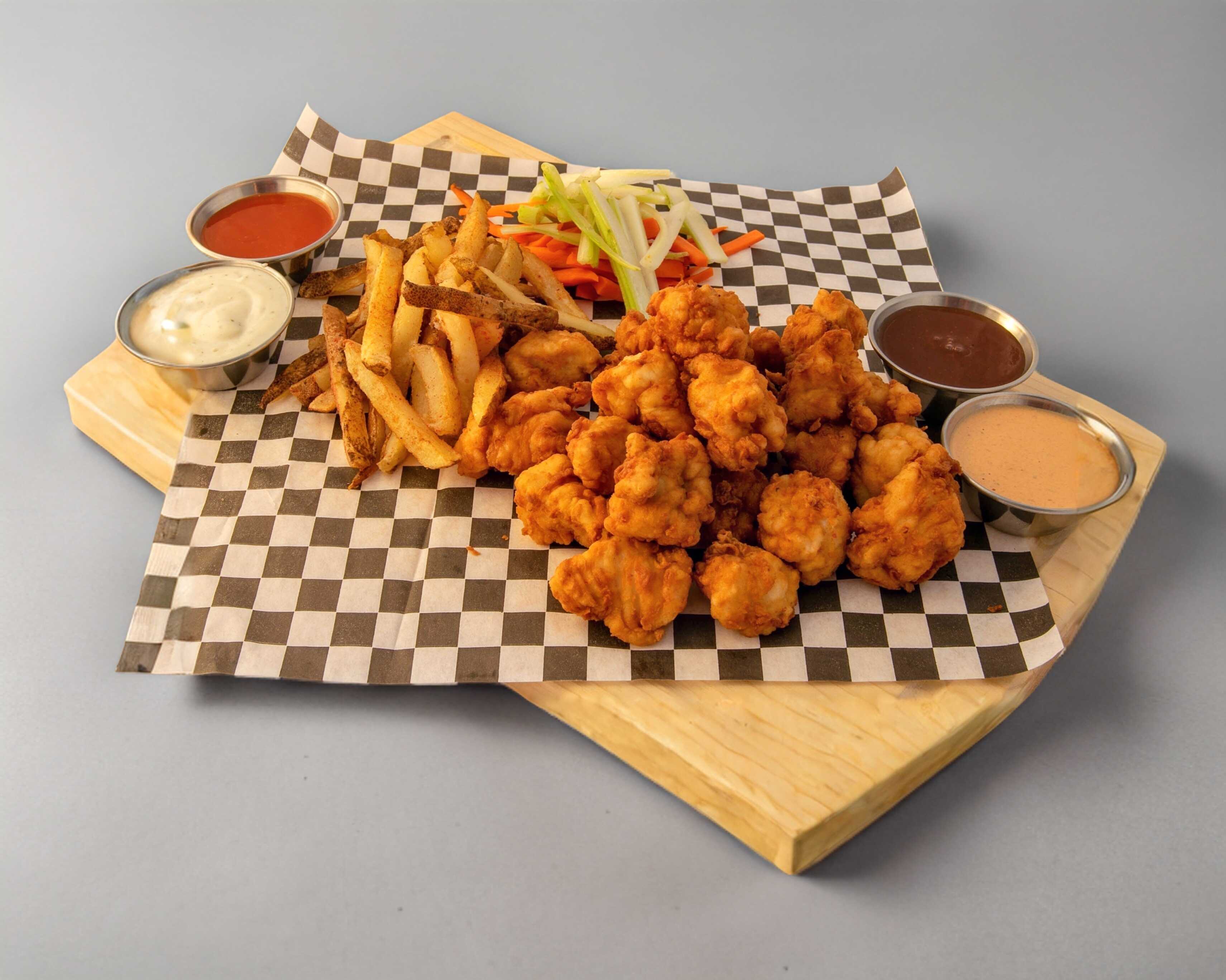 Boneless, alitas y bubas acompañados de papas fritas (para 5 personas).