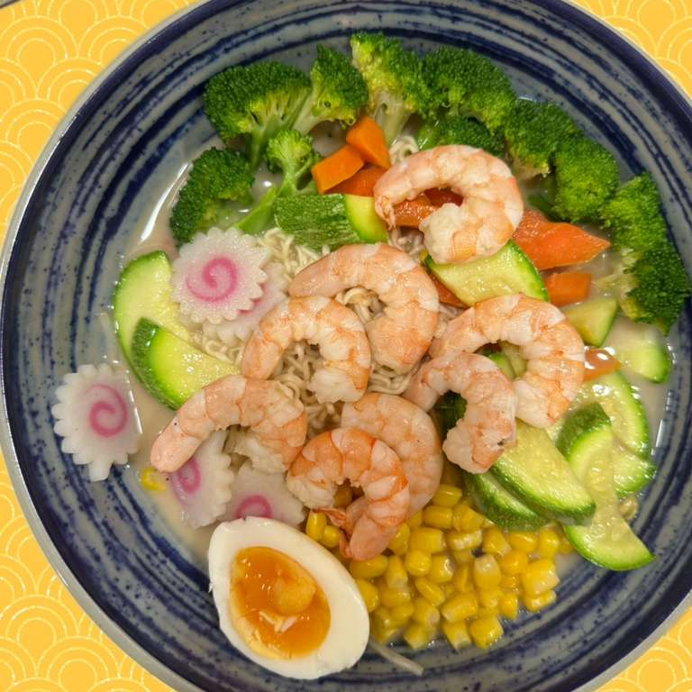 A base de caldo tonkotsu, con calabacita, huevo, elotito, ramen, camarón surimi.