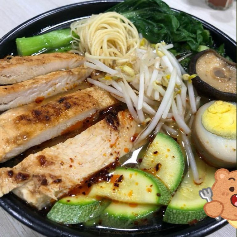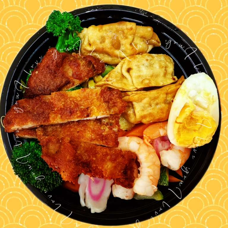 A base de caldo tonkotsu, con calabacita, huevo, elotito, ramen, pollo a la plancha, camarón y gyozas (3 pzas).