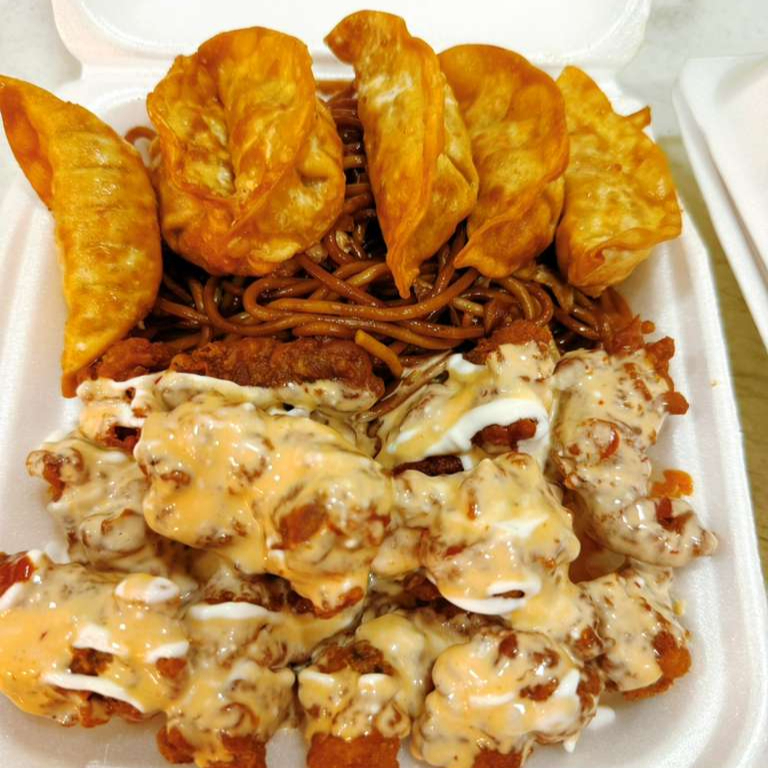 Pollo con chipotle, yakisoba, 5 piezas de gyosas chicas y 5 piezas de gyosas grandes a elegir tus favoritas