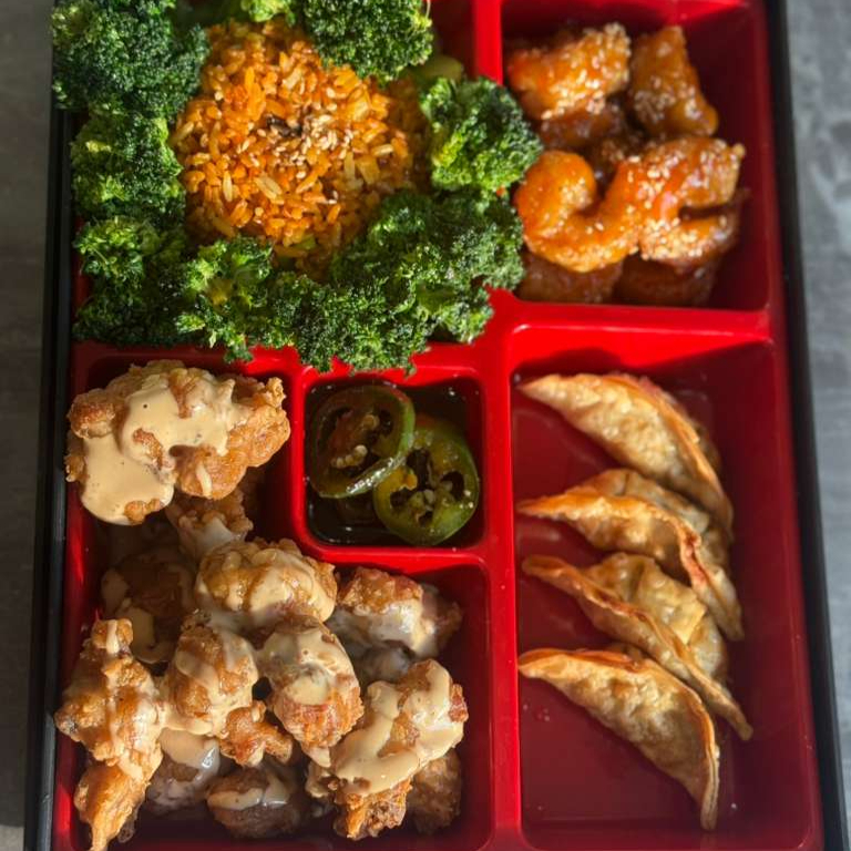 Arroz frito, brócoli, 4 dumplings, pollo chipotle y camarón sararo (opción de sustituir camarón por pescado empanizado).
