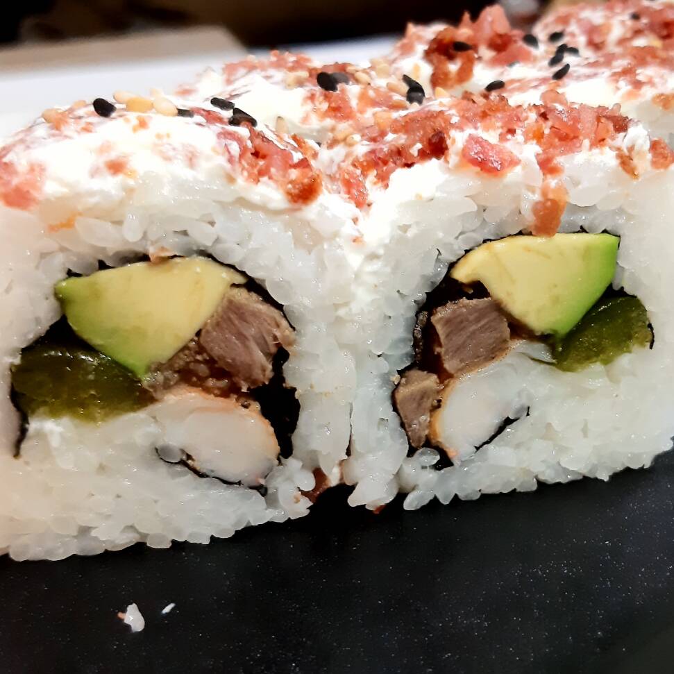 sushibola rellena de quesho philadelphia, aguacate, tampico y carne