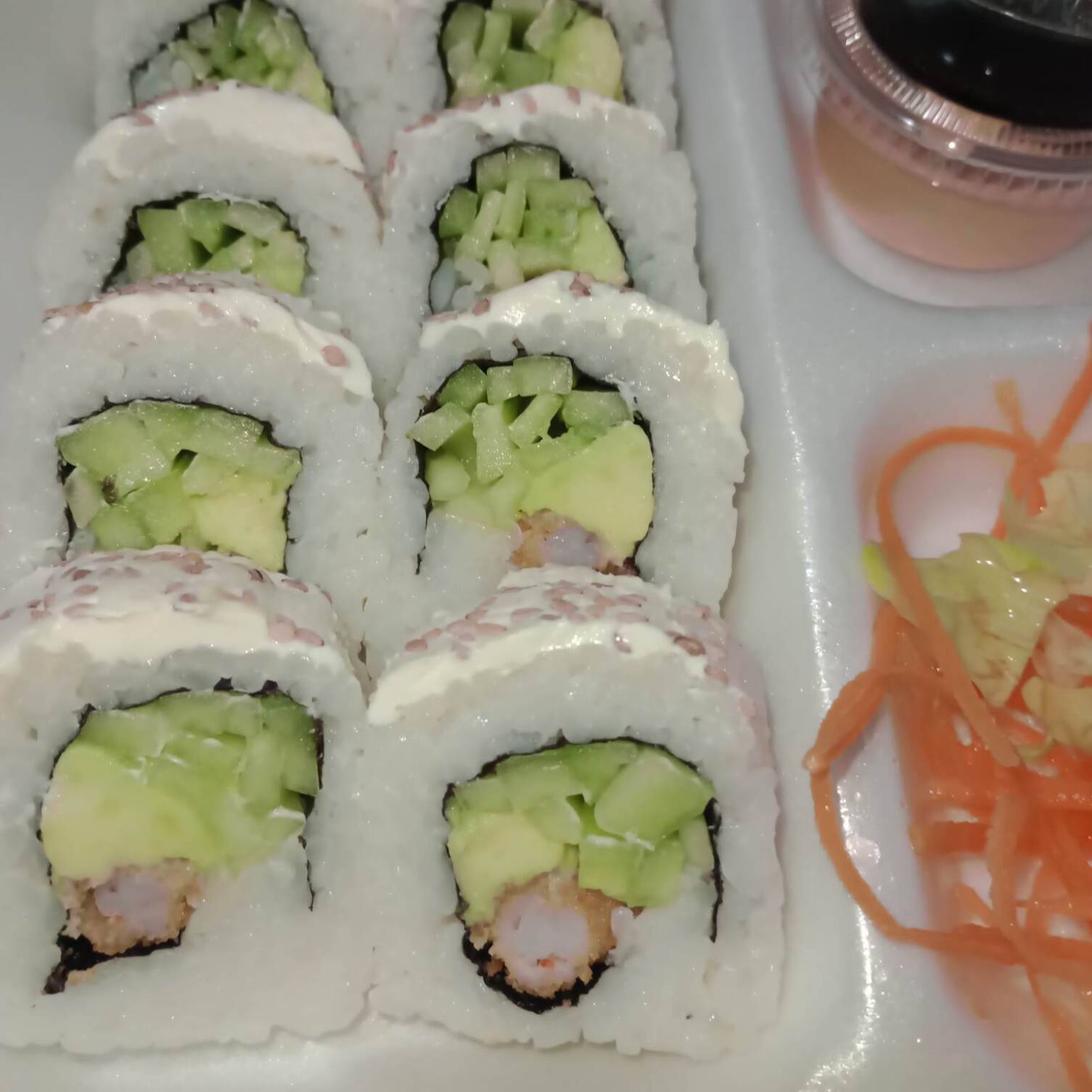 Aguacate, pepino, forrado con Queso Philadelphia y camarón.