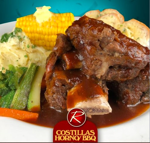 Costillas de Res bañadas en salsa BBQ, con un brasiado de 12 horas, acompañadas de puré de papa, elote y ensalada de Col.