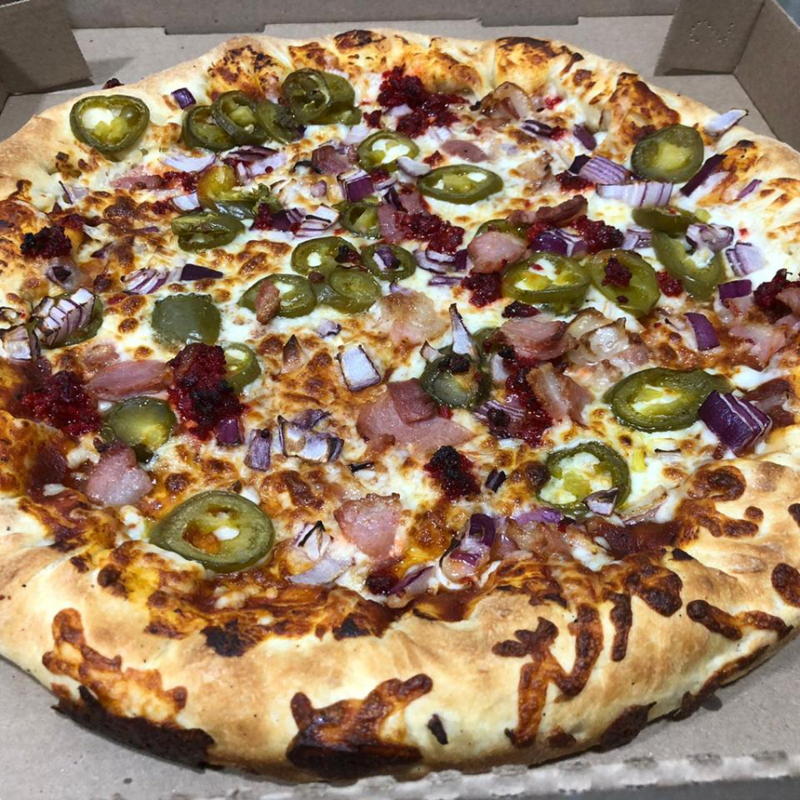 salsa de la casa,queso ,pepperoni , gratinado con queso por fuera y topin de tocino