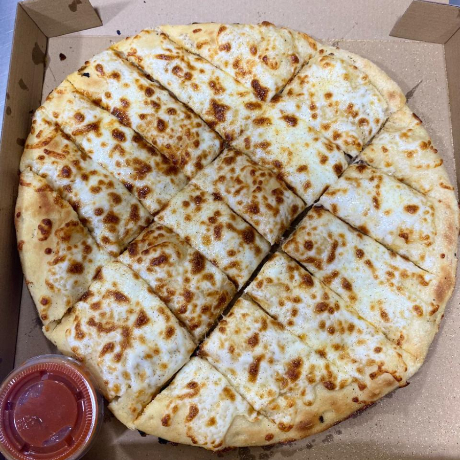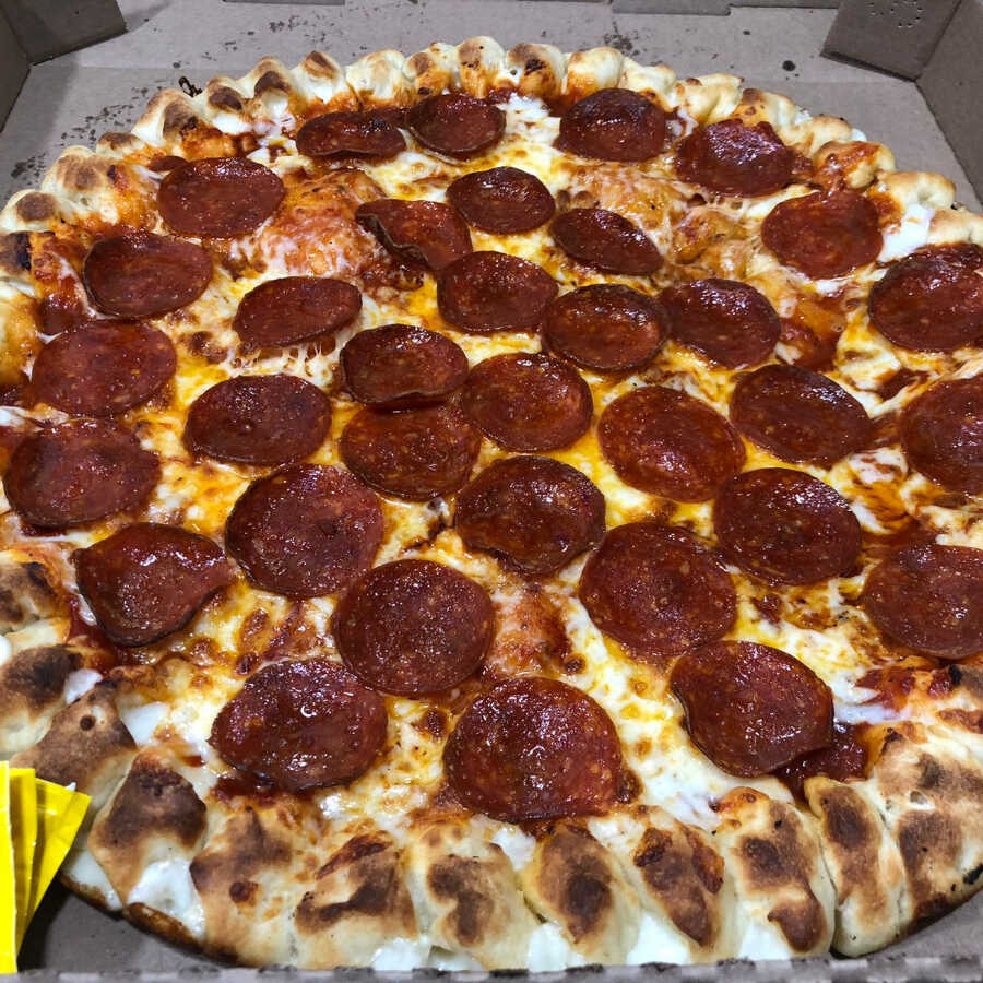 Pizza grande de pepperoni con orilla dedos de queso, incluye aderezos.