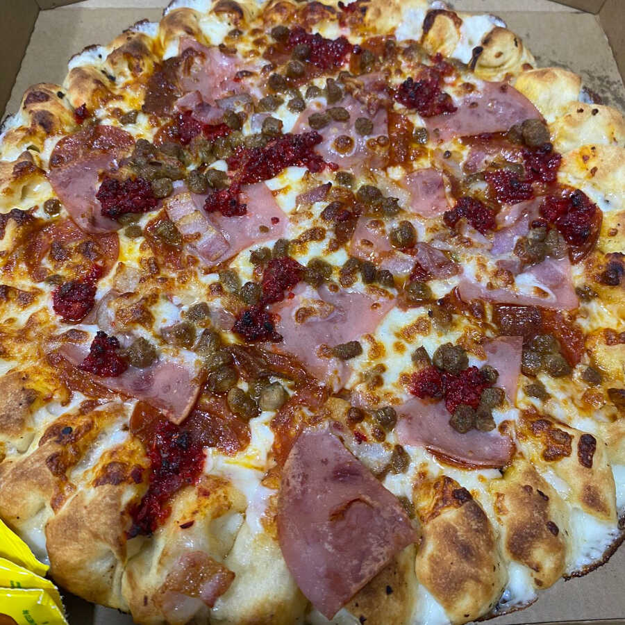 Queso,salsa,pp, tocino, chorizo, jamón, salchicha italiana