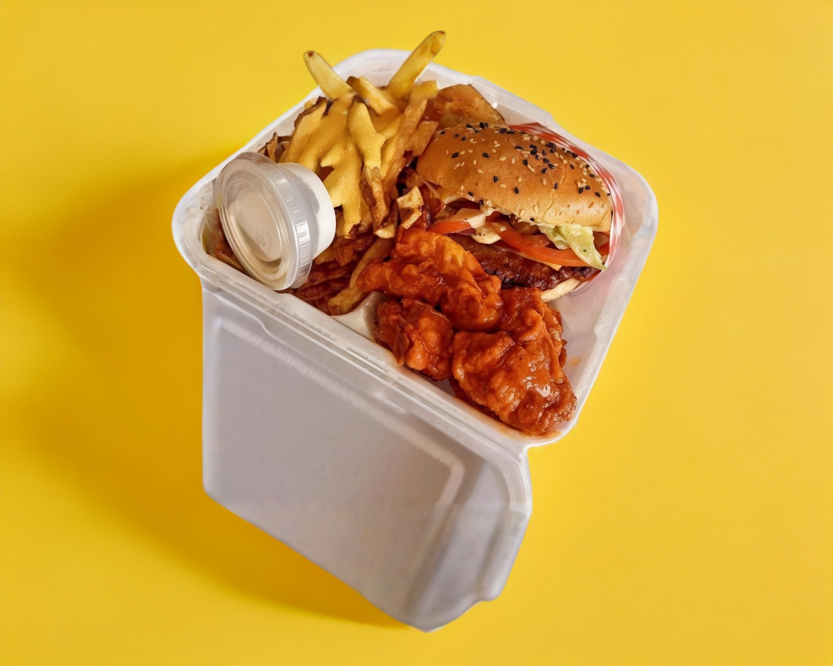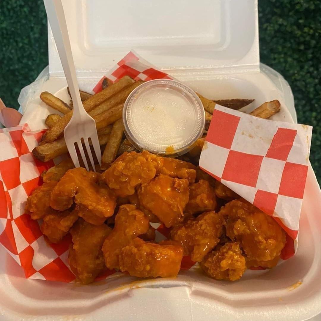 Porción personal de boneless con opción para agrandar, acompañado con papas.