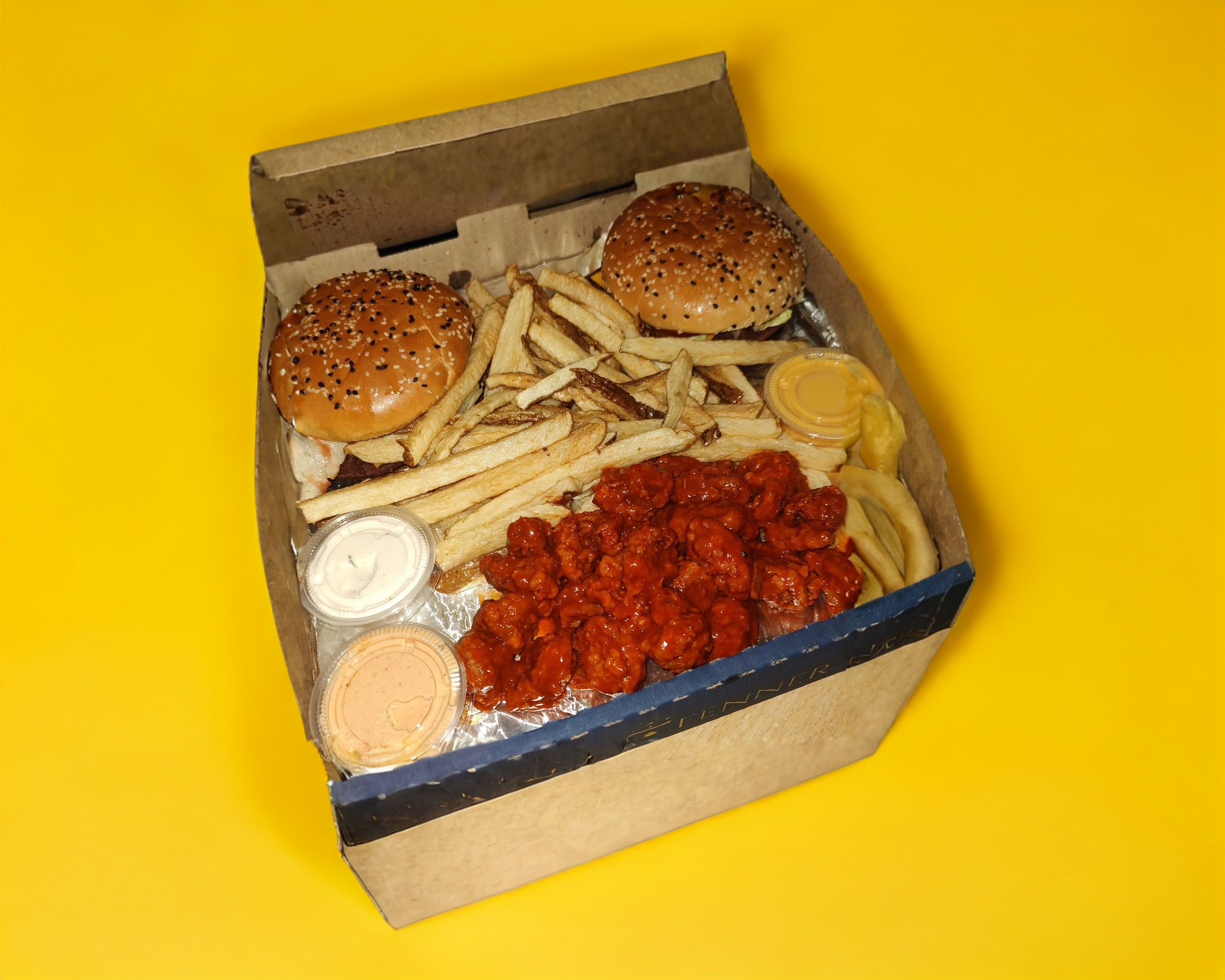 2 hamburguesas(preparadas con lechuga,tomate,cebolla,capsup,mayonesa), porción papas fritas, 150 grs de boneles, 2 quesos de nachos, 1 ranch y 1 chipotle.