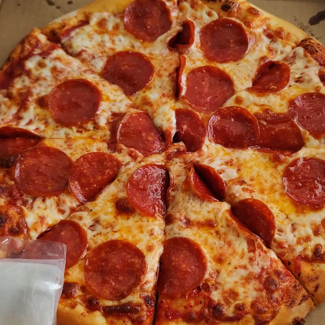 Pizza de 16" cortada en 12 piezas, preparada con salsa de tomate, queso mozzarella y pepperoni