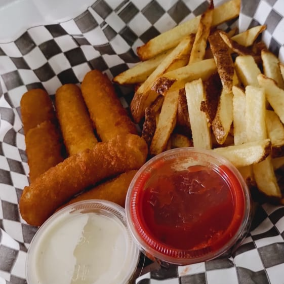 Dedos hechos con queso Mozarela empanizados, una ración de Papas Fritas, Salsa Ragú y Aderezo Ranch