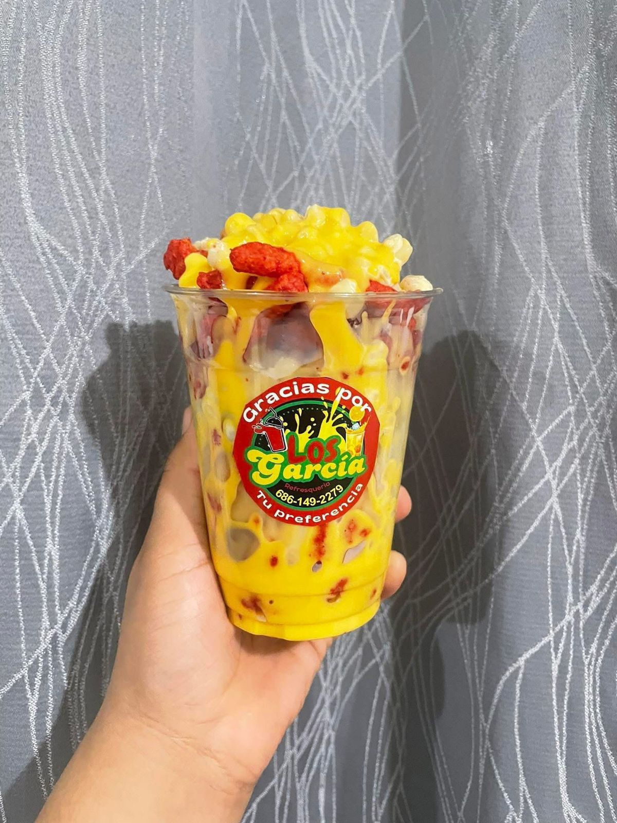 queso de nachos,elote,queso cotija,mayonesa,crema,mantequiilla y chetos flamit